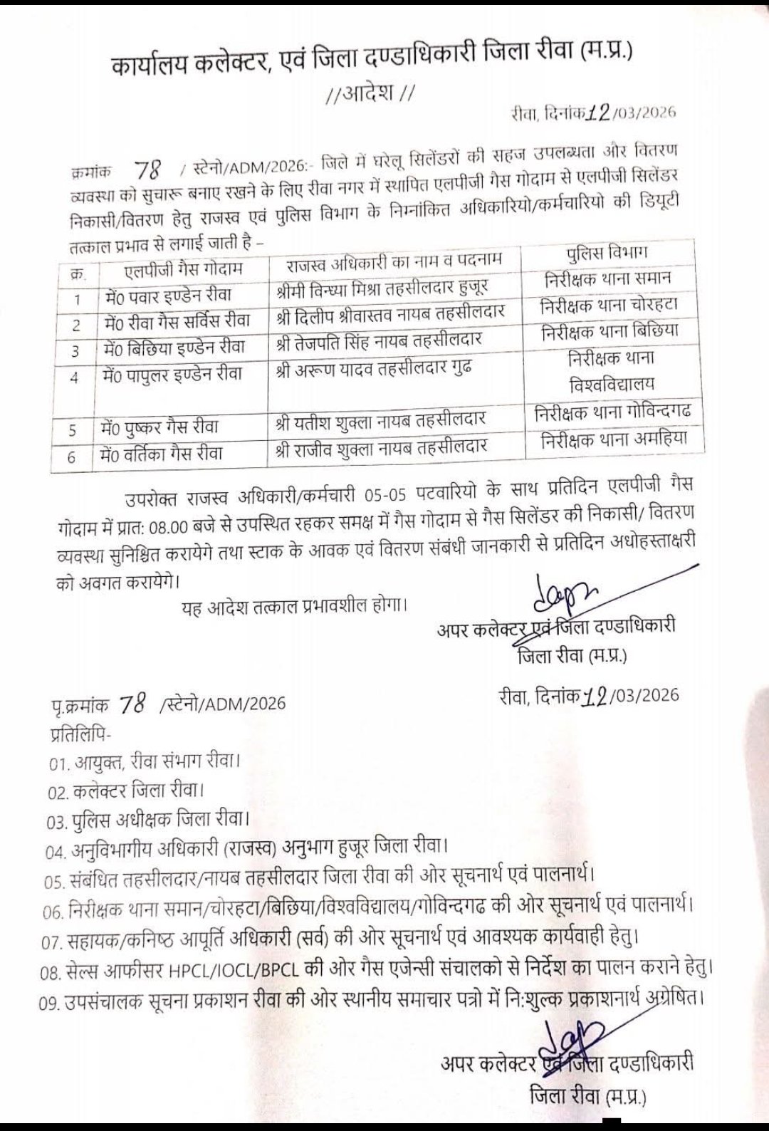 सुरेन्द्र दुबे निष्पक्ष समाचार के लिए संपर्क करें 9425179527 रीवा जिले मे आम नागरिकों को घरेलू गैस सिलेंडर समय पर उपलब्ध कराना और वितरण प्रणाली में किसी भी प्रकार की अनियमितता को रोकने के लिए आदेश जारी…