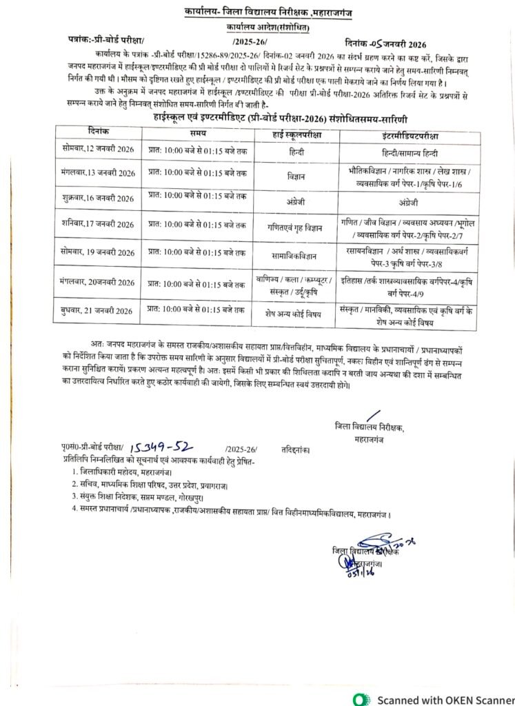 जिला विद्यालय निरीक्षक महराजगंज ने प्री-बोर्ड परीक्षाओं का बदला समय-सारणी अब हाईस्कूल व इंटरमीडिएट कक्षा 10 व 12 की प्री-बोर्ड परीक्षाएं 12 जनवरी से शुरू होगी। आपको बता दें कि जो प्री-बोर्ड की परीक्षा 10 जनवरी से शुरू होने वाली थी उसमें बड़ा बदलाव करते हुए दुसरा समय – सारणी आज जारी किया गया है यह फैसला घने कोहरे व अत्यअधिक ठंड मौसम को देखते हुए लिया गया है। जिला विद्यालय निरीक्षक महराजगंज प्रदीप कुमार शर्मा ने बताया कि जो हाईस्कूल व इंटरमीडिएट की प्री-बोर्ड परीक्षाएं 10 जनवरी से शुरू होने वाली थी उसके समय सारणी में घने कोहरे और अत्यधिक ठंड को देखते हुए बदलाव किया गया है अब यह परीक्षाएं 12 जनवरी से शुरू होकर शुरू होकर 21 जनवरी 2026 तक एक ही पाली में कराने का निर्णय लिया गया है अब हाईस्कूल व इंटरमीडिएट की परीक्षा एक ही पाली में प्रातः पाली में समय 10:00 बजे से 01:15 बजे तक सम्पन्न कराई जाएगी। आपको यह भी ज्ञात करा दें कि यह परीक्षा अतिरिक्त प्रश्न पत्र सेट ही कराई जाएगी। समस्त प्रधानाचार्य गणो को निर्देशित करते हुए जिला विद्यालय निरीक्षक महराजगंज ने कहा कि परीक्षा सुचिता बनाए रखते हुए इसमें किसी भी प्रकार कि शिथिलता न बरती जाए अन्यथा की दशा में सम्बंधित को उत्तरदायित्व निर्धारित करते हुए कठोर कार्रवाई की जायेगी।