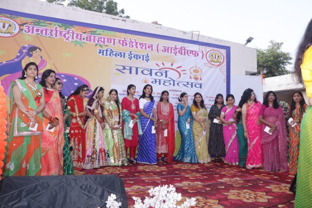 जोधपुर, अंतर्राष्ट्रीय ब्राह्मण फेडरेशन (आईबीएफ) की महिला इकाई के द्वारा आयोजित मेगा सावन उत्सव हर्षोल्लास के साथ संपन्न हुआl फेडरेशन की संभागीय अध्यक्ष डॉ. स्वाति शर्मा एवं कार्यक्रम संयोजिका डिंपल गौड़ ने बताया कि कार्यक्रम फेडरेशन के प्रदेशाध्यक्ष हस्तीमल सारस्वत एवं जिलाध्यक्ष राजेश सारस्वत के सानिध्य में आयोजित किया गया। कार्यक्रम में सूरसागर विधायक देवेंद्र जोशी, नगर निगम उत्तर की महापौर कुंती देवड़ा, नगर निगम दक्षिण की महापौर वनिता सेठ तथा पूर्व महापौर रामेश्वर दाधीच अतिथि के रूप में मौजूद रहे। कार्यक्रम की शुरुआत भगवान परशुराम के चित्र के समक्ष दीप प्रज्वलित करके की गई। कार्यक्रम का संचालन पूजा राजपुरोहित द्वारा किया गया।
