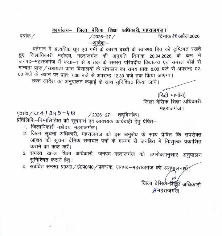 कक्षा 1से लेकर 8 तक के विद्यालयो के समय सारिणी में हुआ बदलाव पहले के समय सारिणी के अनुसार विद्यालय सुबह 8 बजे से अपराह्न 2 बजे चलते थे अब उनके समय सारिणी में बदलाव करते हुए महराजगंज जिला बेसिक शिक्षा अधिकारी रिद्धि पाण्डेय ने समस्त परिषदीय व मान्यता प्राप्त विद्यालयों को सुबह 7:30 से 12:30 बजे तक चलाने आदेश दिया है। यह फैसला अत्यधिक गर्मी व लू चलने एवं बच्चों के स्वास्थ्य हित को देखते लिया गया है।
