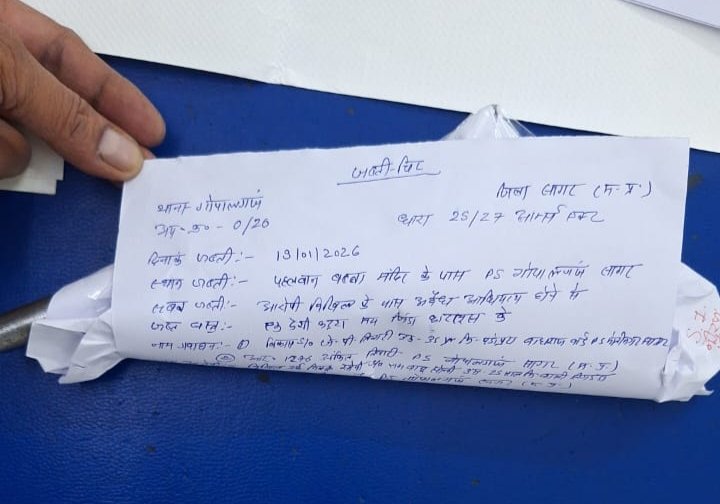 पूछताछ में आरोपी ने अपना नाम निखिल उर्फ निक्कू सोनी, पिता रामबाबू सोनी, उम्र 25 वर्ष, निवासी थाना कोतवाली, जिला सागर बताया। वैधानिक अनुमति लेकर की गई तलाशी में आरोपी के कब्जे से एक लोहे का अवैध देसी कट्टा एवं एक जिंदा कारतूस बरामद किया गया।आरोपी द्वारा हथियार रखने संबंधी कोई वैध लाइसेंस प्रस्तुत नहीं किया गया।अवैध हथियार को विधिवत जप्त कर आरोपी को गिरफ्तार कर न्यायालय में प्रस्तुत किया गया।अवैध धारदार खंजर सहित आरोपी गिरफ्तार* थाना गोपालगंज पुलिस द्वारा की गई एक अन्य कार्यवाही मेंएक युवक संदिग्ध अवस्था में पकड़ा गया, जिसकी तलाशी लेने पर उसके कब्जे से एक अवैध धारदार लोहे का खंजर बरामद किया गया।आरोपी उक्त खंजर रखने संबंधी कोई वैध दस्तावेज प्रस्तुत नहीं कर सका।अतः आरोपी के विरुद्ध वैधानिक कार्यवाही करते हुए अवैध धारदार खंजर जप्त कर आरोपी को विधिवत गिरफ्तार किया गया एवं न्यायालय में प्रस्तुत किया गया।थाना प्रभारी गोपालगंज की सराहनीय भूमिका रही। इन दोनों अवैध हथियार संबंधी सफल कार्यवाहियों मेंथाना प्रभारी गोपालगंज निरीक्षक श्री घनश्याम शर्मा के कुशल नेतृत्व, सतर्क निगरानी एवं प्रभावी रणनीति की महत्वपूर्ण भूमिका रही।उनके निर्देशन में कार्यरत पुलिस टीम ,उप निरीक्षक नीरज जैन,प्रधान आरक्षक 1302 अनिल प्रभाकर,प्रधान आरक्षक 1672 दीपक व्यास,आरक्षक 1276 अंकित तिवारी,आरक्षक 1203 रणवीर,आरक्षक 1483 नेकराम,आरक्षक 1136 चंद्रकांत मिश्रा,आरक्षक 133 हीरेंद्र ,आरक्षक चालक देवेंद्र पाण्डे,आरक्षक 837 दशरथ