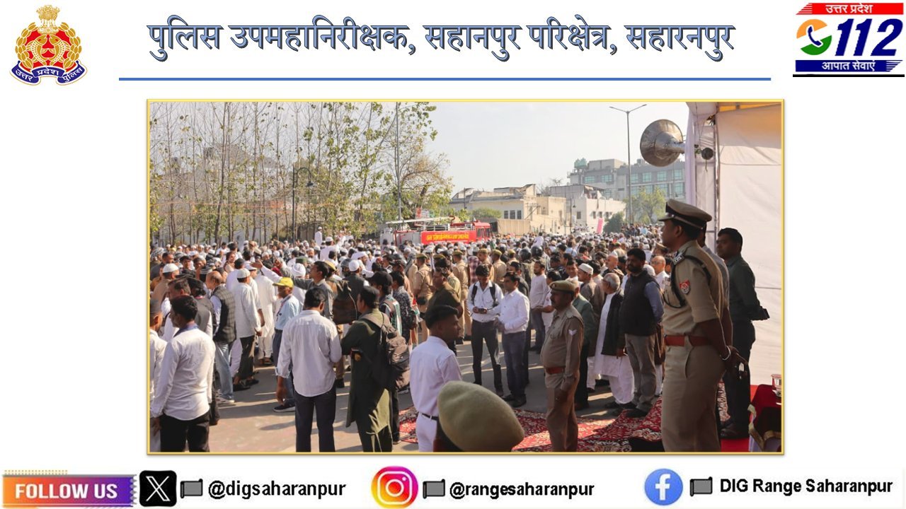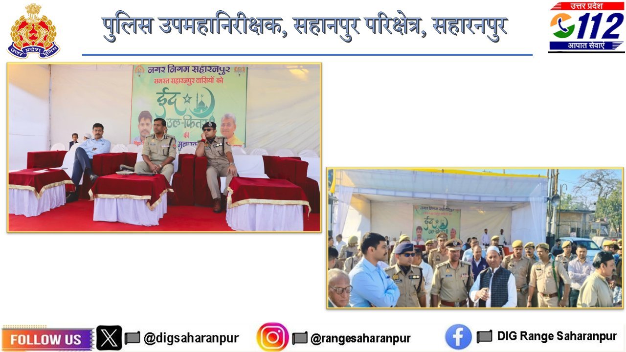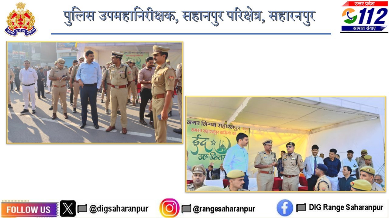आज दिनांक 21.03.2026 को ईद-उल-फितर पर्व के मद्देनज़र परिक्षेत्र सहारनपुर में कानून-व्यवस्था को सुदृढ़ बनाए रखने के उद्देश्य से पुलिस एवं प्रशासन पूरी तरह सक्रिय नजर आया। इसी क्रम में अभिषेक सिंह (पुलिस उपमहानिरीक्षक, सहारनपुर परिक्षेत्र) द्वारा जनपद सहारनपुर के थाना कुतुबशेर क्षेत्रांतर्गत अंबाला रोड स्थित बड़ी ईदगाह पर पहुंचकर नमाज़ की व्यवस्थाओं का स्थलीय निरीक्षण किया गया। इस दौरान उनके साथ मनीष बंसल (जिलाधिकारी), अभिनन्दन (वरिष्ठ पुलिस अधीक्षक), व्योम बिंदल (पुलिस अधीक्षक नगर) सहित अन्य पुलिस एवं प्रशासनिक अधिकारी भी मौजूद रहे।