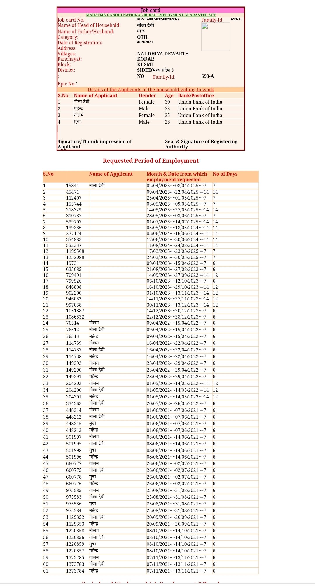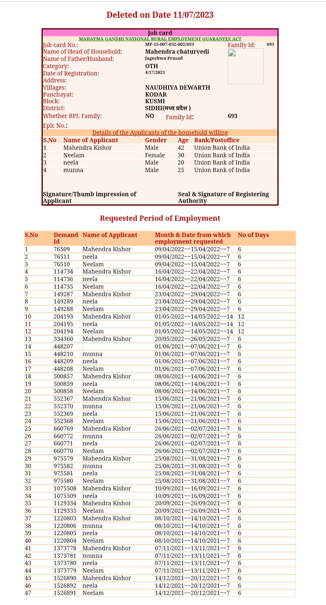 दूसरा जॉब कार्ड नीला देवी पति महेंद्र के नाम पर जॉब कार्ड क्रमांक एमपी-15-007-032-002/ 693 -ए पहले जॉब कार्ड के दो दिन बाद ही यानी 19 अप्रैल 2021 को बनाया जिसमें महेंद्र की उम्र घटकर 35 वर्ष नीला देवी की 30 वर्ष नीलम की 25 वर्ष और मुन्ना की 28 वर्ष हो गई। इसमें भी सभी का बैंक खाता यूनियन बैंक आफ इंडिया में होना लेख किया गया है।