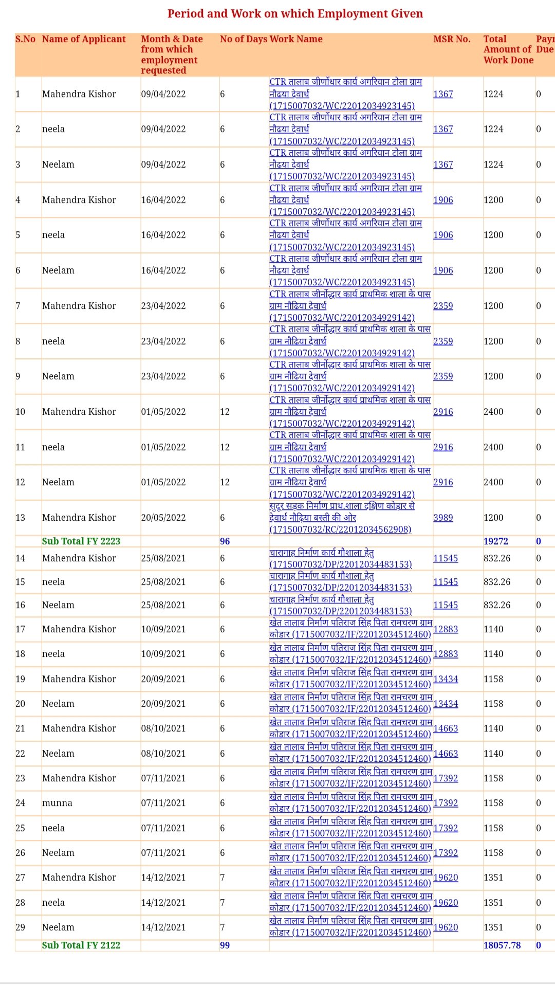4- 20 मई 2022 से 26 मई 2022 तक महेंद्र, नीलम और नीला सुदूर सड़क निर्माण प्राथमिक शाला दक्षिण कोडार में नौढिया देवार्थ बस्ती की ओर मैं काम कर रहे हैं और इसी दरमियान दूसरे जॉब कार्ड में भी नीला देवी तथा तीसरे जॉब कार्ड में महेंद्र को इसी काम में लगाया गया है।