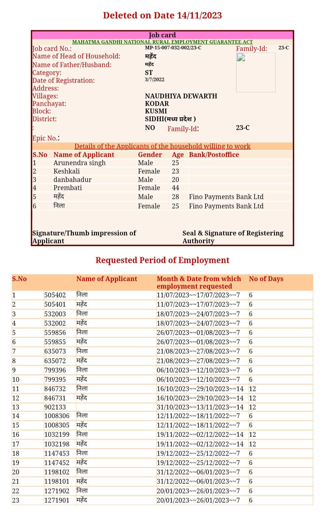 पांचवा जॉब कार्ड एमपी- 15-007-032 -002/ 692-सी 18 नवंबर 2022 को बनाया गया जिसमें महेंद्र की उम्र 28 वर्ष और नीलू की उम्र 35 वर्ष बताई गई है इसमें दोनों का बैंक खाता फिनो पेमेंट्स बैंक में होना लेख किया गया है। इस जॉब कार्ड को 29 दिसंबर 2023 को डिलीट कर दिया गया।