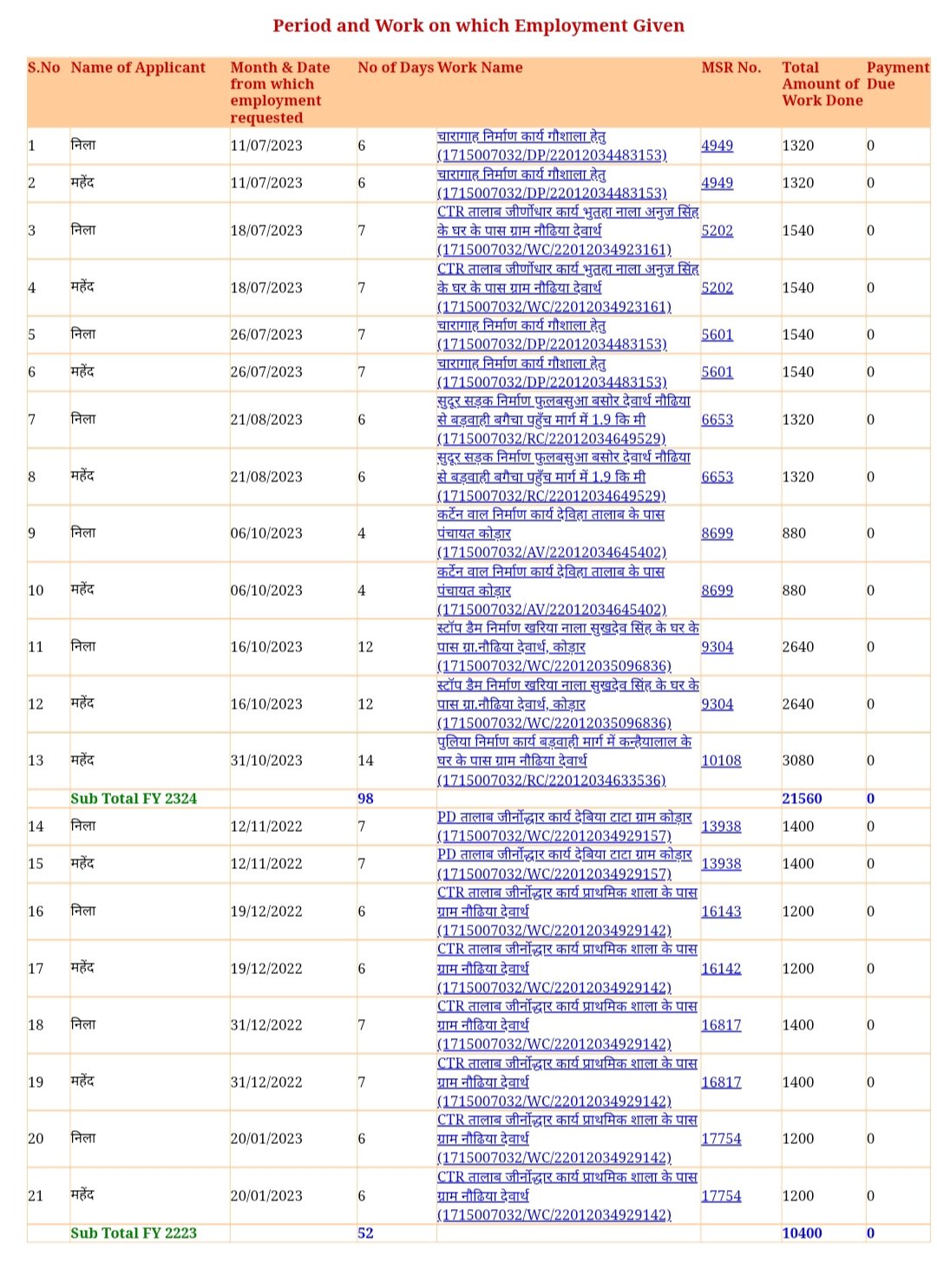 10- दूसरे जॉब कार्ड में नीला देवी 16 अक्टूबर 2023 से 29 अक्टूबर 2023 तक स्टाप डैम निर्माण खारिया नाला में सुखदेव सिंह के घर के पास काम कर रही हैं वही चौथे जॉब कार्ड में उसी दरमियान महेंद्र और निला इसी कार्य में लगे हुए हैं साथ ही साथ पांचवें जॉब कार्ड में 16 अक्टूबर 2023 से 29 अक्टूबर 2023 तक ही नीलू को इसी कार्य में लगाया गया है।