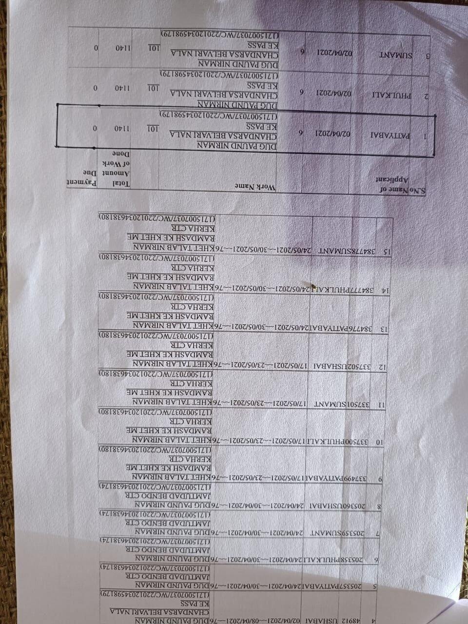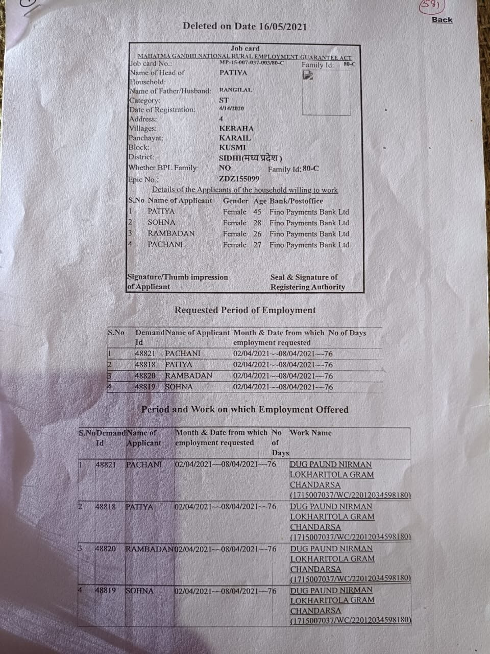 पहला जॉब कार्ड- एमपी 15-007-037-003-112/A दिनांक 14 अप्रैल 2021 रंगीलाल के अलावा पारिवारिक सदस्य पतिया,अनारकली, फूलकली और कलिता।