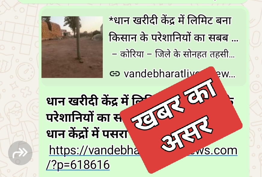 खबर के माध्यम से किसानों की आवाज शासन प्रशासन तक पहुँचते ही संबंधित विभाग हरकत में आया। और सोनहत धान खरीदी केंद्रों में लिमिट पिछले की अपेक्षा 500 क्विंटल रजौली धन खरीदी केंद्र में 300क्विंटल बढ़ा कर 1000 क्विंटल कर दिया गया है अकलासरई में 180 क्विंटल से बढ़ा कर अब 300क्विंटल कर दिया है इसी तरह अन्य केंद्रों पर भी कुछ इजाफा किया गया है ।