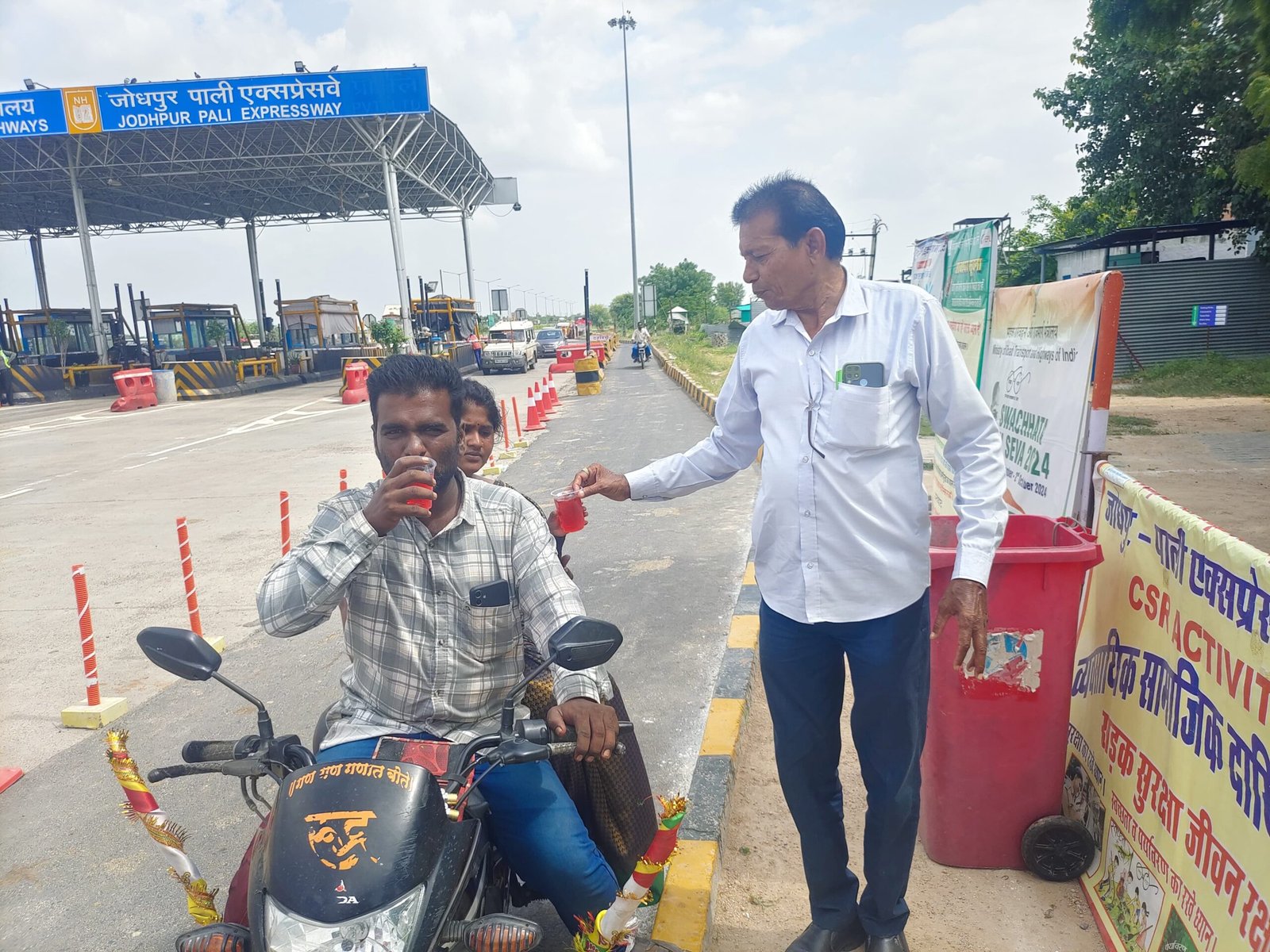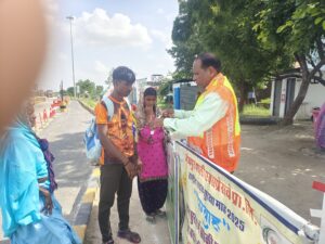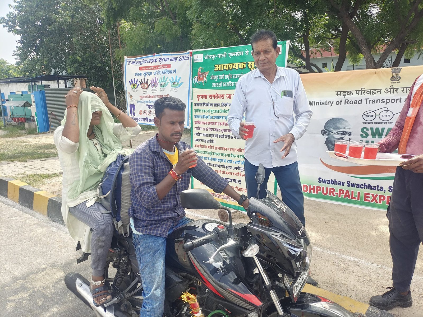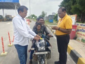 पाली:शासन की सर्वोच्च प्राथमिकता सड़क सुरक्षा जीवन रक्षा के तहत् दैनिक आधार पर पाली कलेक्टर एल एन मंत्री, पुलिस अधीक्षक पाली पूजा अवाना के निर्देशानुसार आज गाजनगढ़ टोल से गुजरने वाले रामदेवरा जा रहे पैदल जातरूओ को जिला परिवहन अधिकारी पाली विजय कुमार मीणा सार्वजनिक निर्माण विभाग पाली सहायक अभियंता सलोनी पारीख की उपस्थित में चिलचिलाती गर्मी में रामदेवरा श्रद्धालुओं को गर्मी में मीठा शरबत एवं ग्लूकोज का वितरण किया गया। साथ ही शंकर फुलवारिया की उपस्थित मे रामदेवरा श्रद्धालुओं के हाथ में रेडियम बेल्ट साथ ही उनके बैग एवं हेलमेट के पीछे रेडियम स्टिकर लगाए जा रहे हैं। साथ ही ट्रैफिक नियमों की जानकारी दी गई ।वरिष्ठ सीएसआर मैनेजर फिरोज़ ख़ान ने बताया कि टोल प्लाजा गाजनगढ़ से जाने वाले प्रत्येक रामदेवरा जातरूओ के लिए ये सेवाएं दैनिक आधार पर चलती रहेंगी। रेडियम हैंड बेल्ट स्टीकर के कारण रात में वाहन चालकों को ये जातरू दूर से दिखाई देंगे जिससे दुघर्टना होने की संभावना काफ़ी कम हो जायेगी।आप ट्रैफिक के नियमों का पालन करें।इस मौके पर टोल कर्मी उपस्थित रहे।