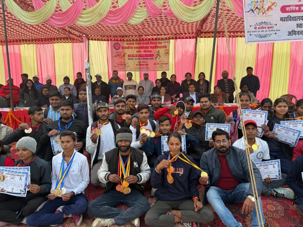 स्वतंत्रता संग्राम सेनानी विश्राम सिंह राजकीय महाविद्यालय चुनार मीरजापुर में आज दिनांक 27 दिसंबर 2025 को द्विदिवसीय वार्षिक क्रीड़ा समारोह के समापन के अवसर पर महाविद्यालय की प्राचार्या प्रोफेसर डॉ माधवी शुक्ला ,अतिथि आलोक पटेल एवं डॉ अभय वर्मा, विभागाध्यक्ष डिपार्टमेंट ऑफ फार्मेसी एपेक्स हॉस्पिटल ने विजेता खिलाड़ियों को पुरस्कार प्रदान किया।