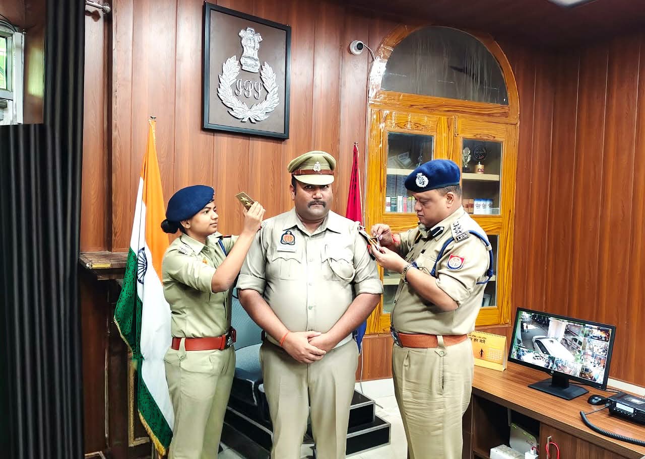 जनपद मीरजापुर वरिष्ठ पुलिस अधीक्षक ने यातायात प्रभारी विपिन कुमार पांडे के कंधे पर पद प्रतीक चिन्ह स्टार लगाकर दी गई बधाई