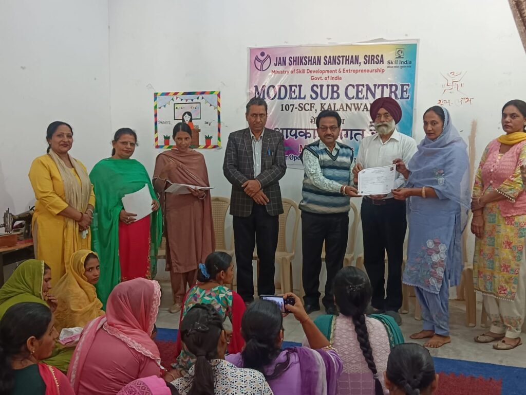 जन शिक्षण संस्थान सिरसा, कौशल विकास एवं उद्यमिता मंत्रालय भारत सरकार द्वारा आज कालांवाली स्थित माइल सेंटर मे प्रमाण