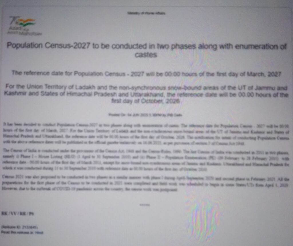 वंदेभारतलाइवटीव न्युज-: प्राप्त हुई जानकारी के अनुसार केन्द्र सरकार जातीय जनगणना का कार्य दो चरणों मे करवाएगी। केंद्रीय गृहमंत्रालय ने आज बुधवार 04 जून खो बतलाया कि जातीय जनगणना का प्रथम चरण की शुरुआत 01 अक्टूबर 2026से होगी। प्रथम चरणा में 4 पहाड़ी राज्यों-: लद्दाख, जम्मू-कश्मीर, उत्तराखंड, तथा हिमाचल प्रदेश मे जातीय जनगणना होगी। दूसरे चरण में 01 मार्च 2027 से शुरू होगा। दूसरे चरण में देश के बाकी राज्यों में जातीय जनगणना की जायेगी। गृहमंत्रालय ने प्रेस रिलीज में बतलाया कि जातियों की गणना के साथ ही देश की जनगणना कार्य भी कराए जाने का निर्णय लिया गया है। इससे संबंधित जानकारी 16 जून 2025 को आधिकारिक राजपत्र में प्रकाशित किया जा सकता है।।ज्ञात हो कि केंद्र सरकार ने 30 अप्रैल 2025 को देश में जातीय जनगणना कराए जाने की घोषणा की थी। भारत में आजादी मिलने के बाद यह पहली जातीय जनगणना होगी। केंद्रीय मंत्री अश्विनी वैष्णव जी ने कहा कि जातीय जनगणना को मूल जनगणना के साथ साथ करवाया जायेगा। देश में पिछली बार जनगणना कार्य वर्ष 2011 में किया गया था। जनगणना कार्य प्रति दस वर्ष में एक बार किया जाता है। वर्ष 2021 में जनगणना होनी थी किन्तु उस समय देश में कोरोना महामारी का प्रकोप के चलते इसे टाल दिया गया था। प्राप्त जानकारी अनुसार केंद्र सरकार जातीय जनगणना से पहले जातियों की एक सूची तैयार करेगी जिससे जातियों का सही सही आंकड़ा एकत्रित हो सकेगा। जातियों पल राजनीतिक सहमति बनाने के लिए इसे सर्वदलीय बैठक में रखा जायेगा। सभी जातियों की मान्य सूची जरूरी है क्योकि अनुसूचित जाति एवं जनजाति तो गणना में पहले से है। अन्य दूसरे पिछड़े वर्ग की जातियों पर संदेह है। कांग्रेस पार्टी सहित अन्य दूसरे विपक्षी पार्टियों ने जातीय जनगणना कराए जाने की मांग लंबे समय से करते आ रहे हैं। अब जातीय आधारित जनगणना कराए जाने पर केंद्र की नरेंद्र मोदी जी की सरकार तैयार हो गई है।