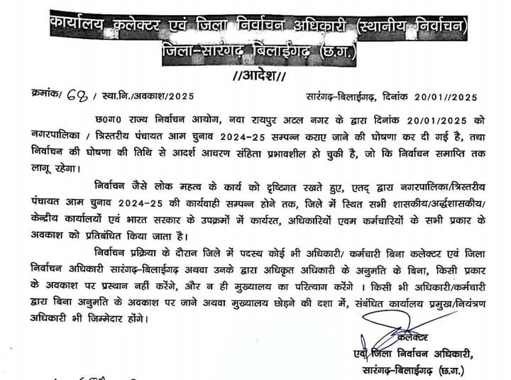 सारंगढ़ बिलाईगढ़, 22 जनवरी 2025/निर्वाचन आचार संहिता लागू होने पर छत्तीसगढ़ राज्य निर्वाचन आयोग के निर्देशानुसार कलेक्टर व जिला निर्वाचन अधिकारी धर्मेश कुमार साहू ने निर्वाचन जैसे लोक महत्व के कार्य को दृष्टिगत रखते हुए नगरीय निकाय और पंचायत आम चुनाव 2025 की कार्यवाही संपन्न होने तक जिले में स्थित सभी शासकीय, अर्द्धशासकीय, केन्द्रीय कार्यालयों एवं भारत सरकार के उपक्रमों में कार्यरत अधिकारियों, कर्मचारियों के सभी प्रकार के अवकाश को प्रतिबंधित किया जाता है।