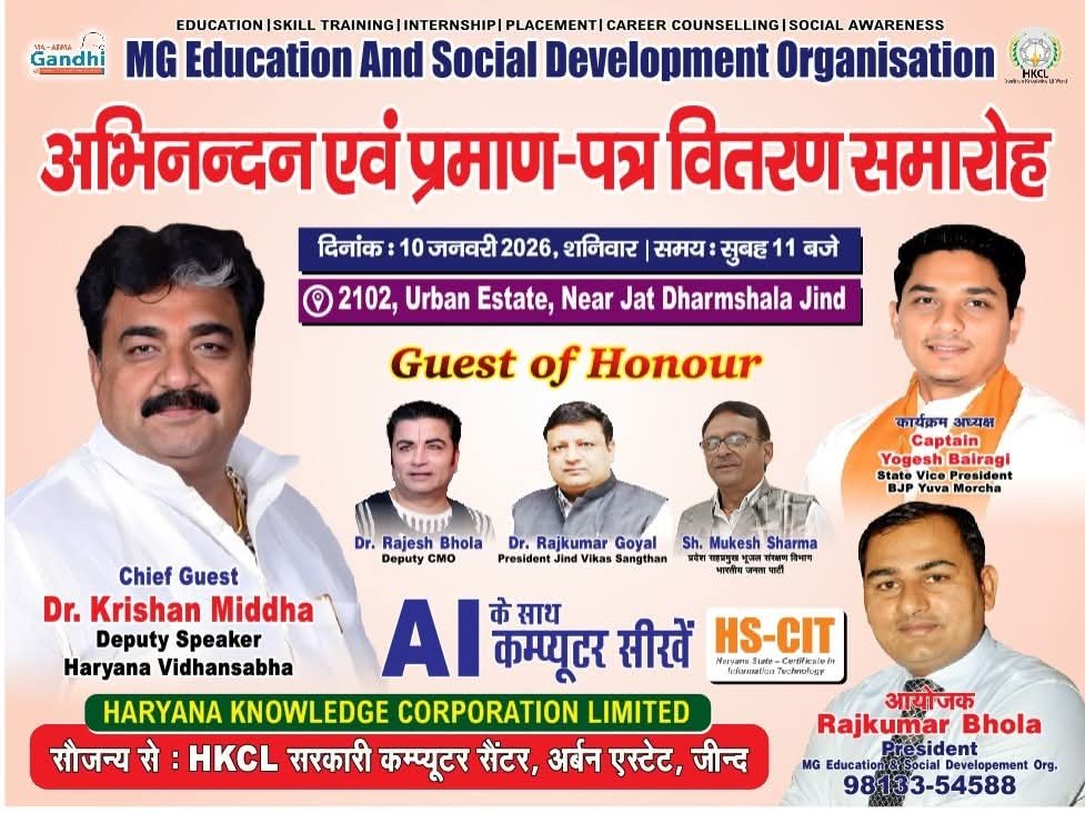 जींद : शिक्षा, कौशल विकास और आत्मनिर्भरता को बढ़ावा देने के उद्देश्य से महात्मा गांधी शिक्षा एवं समाज विकास संगठन द्वारा हरियाणा नॉलेज कारपोरेशन लिमिटेड (एचकेसीएल) के सहयोग से अभिनंदन एवं प्रमाण-पत्र वितरण समारोह का आयोजन किया जा रहा है। यह कार्यक्रम 10 जनवरी 2026 (शनिवार) प्रातः 11 बजे आयोजित होगा। इसको लेकर संस्था कार्यालय, अर्बन एस्टेट जींद में संस्था के अध्यक्ष राजकुमार भोला की अध्यक्षता में एक महत्वपूर्ण बैठक आयोजित की गई, जिसमें अंकिता खटकड़, अजय वर्मा, मेघा सिंगला, ऊषा सैनी सहित अन्य पदाधिकारी उपस्थित रहे।