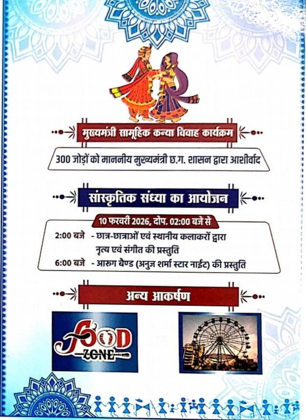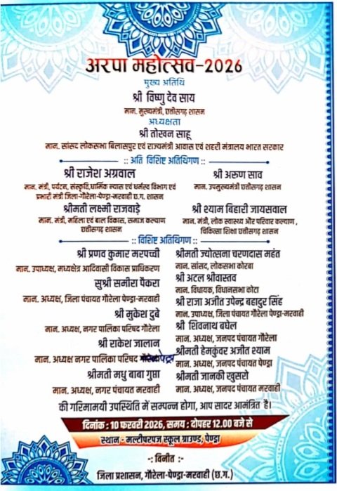 ===- प्राप्त हुई जानकारी के अनुसार छत्तीसगढ प्रदेश के गौरेला पेन्ड्रा मरवाही जिले के स्थापना दिवस 10 फरवरी पर जिला स्तरीय “अरपा महोत्सव” का आयोजन दिनांक 10फरवरी मंगलवार 2026 को किया जा रहा है। अरपा महोत्सव में छग के मुख्यमंत्री विषणुदेवसाय जी मुख्य अतिथि होंगे।