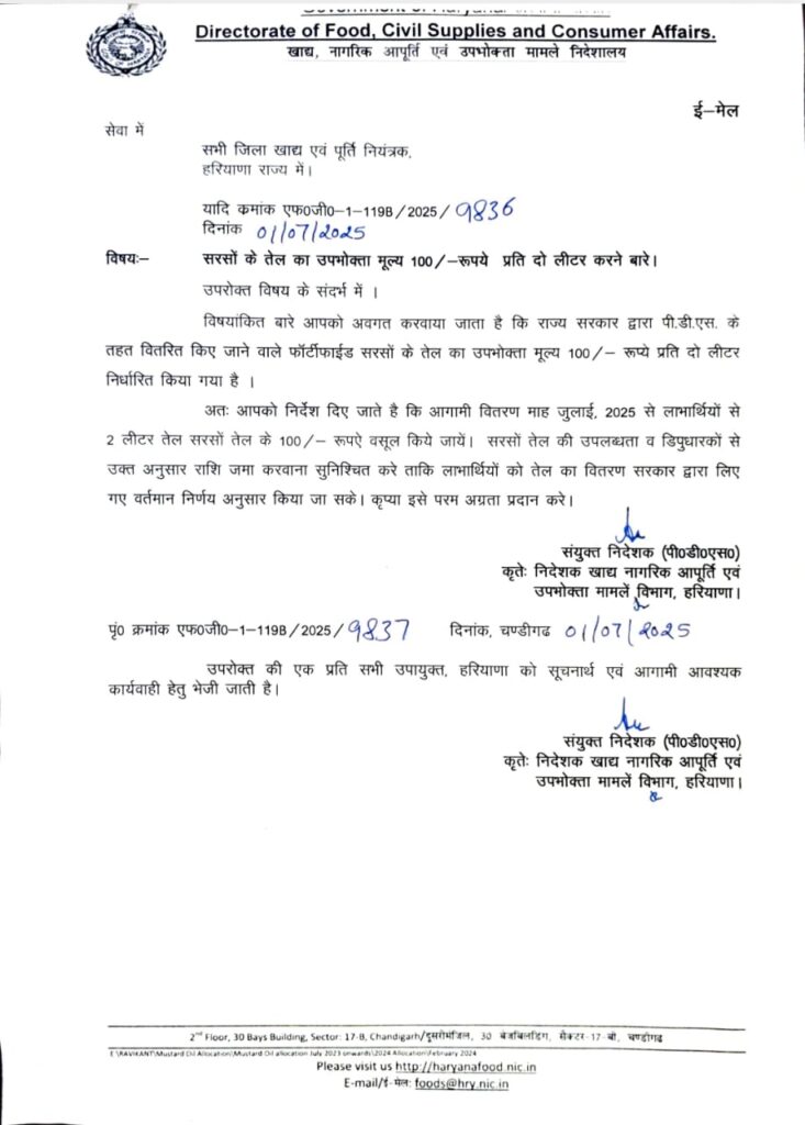कालांवाली : बीपीएल परिवारों मंहगाई का बड़ा झटका लगा। अब सरकार ने डिपूओं से वितरण किए जाने वाले फार्टीफाईड (कच्ची घनी का हैफैड मार्का) सरसों-तेल के लागत मूल्य में 150 फीसदी मूल्य वृद्धि हुई यानि कि डिपूओं से सरसों-तेल पहले प्रति राशनकार्ड दो लीटर 20/- (बीस) रूपए प्रति लीटर के हिसाब से मिलता था।अब वही सरसों-तेल 50/- प्रति लीटर की दर से मिलेगा। यह जानकारी देते हुए आल राशन डिपो होल्डर वेलफेयर एसोसिएशन हरियाणा के मिडिया प्रभारी गुरतेज सिंह सोढ़ी ने बताया कि प्रदेश सरकार द्वारा बीपीएल परिवारों को डिपूओं के माध्यम से वितरण किए जाने वाले फार्टीफाईड (कच्ची घनी का हैफैड मार्का) सरसों तेल के भावों में भारी-भरकम वृद्धि करते हुए दो लीटर सरसों तेल (एक बोतल) का लाभार्थी (कार्डधारक) मुल्य 100/- (एक सौ) रूपए कर दिया है जोकि पहले 20/- (बीस) रूपए प्रति लीटर की दर से दो लीटर का लाभार्थी 40/- (चालीस) रूपए प्रति बोतल था। इस मुल्य वृद्धि वारे खाद्य, नागरिक आपूर्ति एवं उपभोक्ता मामले विभाग चण्डीगढ़ मुख्यालय मुख्यालय से संयुक्त निदेशक (पीडीएस) ने पत्र क्रमांक 1-1198/2025/9836 दिनांक 01-07-2025 जारी करते हुए प्रदेश के सभी जिला नियंत्रणको आदेश दिए हैं कि अपने अधीनस्थ अधिकारियों एवं निरीक्षकों को दिशा-निर्देश जारी करें कि जुलाई माह में डिपूओं पर सरसों-तेल की आपूर्ति नई दर्रों पर यानि प्रति राशनकार्ड पर दो लीटर सरसों तेल लाभार्थी (कार्डधारक) को प्रति बोतल100/- (एक सौ) रूपए में उपलब्ध करवाई जाए तथा डिपू होल्डरों से भी नये वृद्धि मूल्य के अनुसार राशि जमा करवाई जाना सुनिश्चित करें।