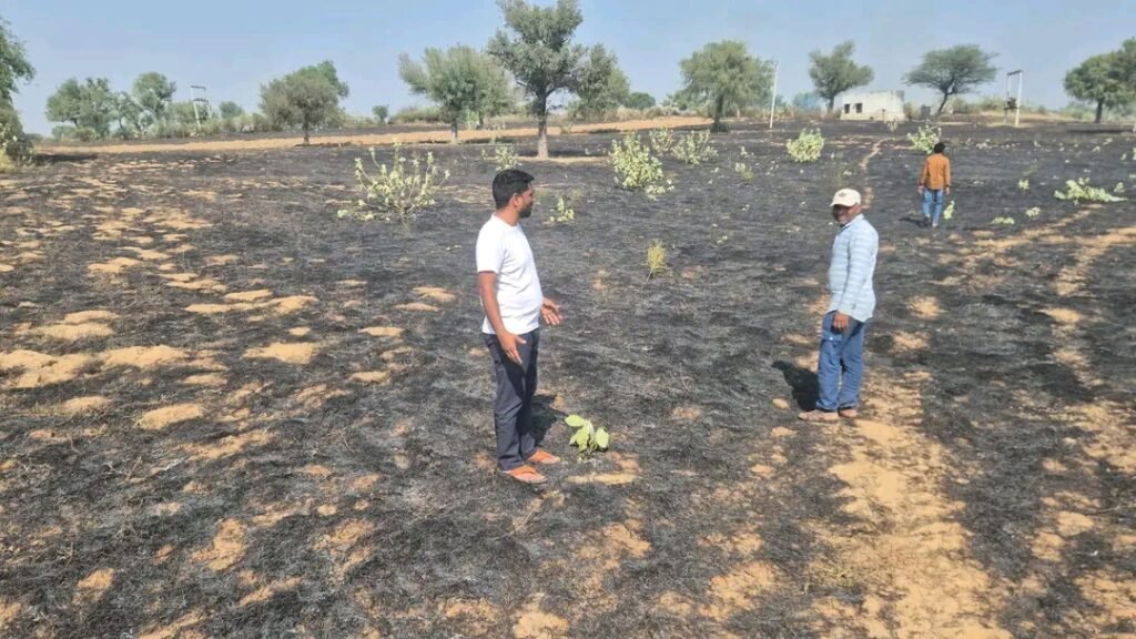 फतेहपुर/सीकर. कस्बे के निकटवर्ती ग्राम आशाश में रविवार दोपहर के समय तीन से चार खेतों में आग लग गई। खेत के मालिक आबिद ने जानकारी देते हुए बताया कि खेतों के अंदर से गुजर रही विद्युत की लाइन के लिए लगे हुए ट्रांसफार्मर से निकली चिंगारी से आग लग गई और देखते ही देखते आग आसपास के तीन से चार खेतों में फैल गई। आग लगने के बारे में फायर ब्रिगेड को सूचित किया गया लेकिन जब तक फायर ब्रिगेड आती तब तक तीन से चार खेतों में आग लगने के कारण पानी सिंचाई के पाइप फसल सहित अन्य सामान जल गया। गांव के ही काफी संख्या में युवा मौके पर पहुंचकर ट्रैक्टर की मदद से आग पर काबू पाया हालांकि फायर ब्रिगेड भी मौके पर पहुंच गई लेकिन मिट्टी के कारण गाड़ी खेतों में नहीं पहुंच सकी।