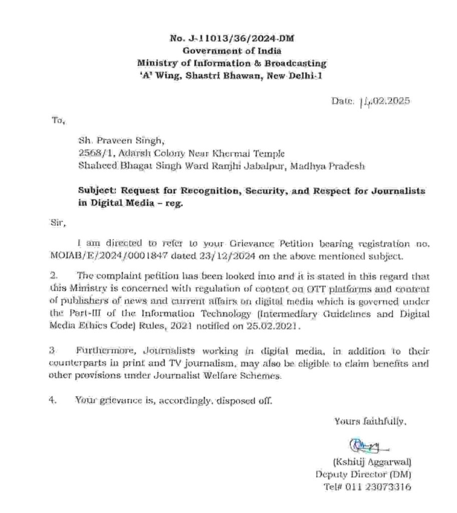 📜 मंत्रालय का पत्र: डिजिटल पत्रकारों को मान्यता और सम्मान का अधिकार