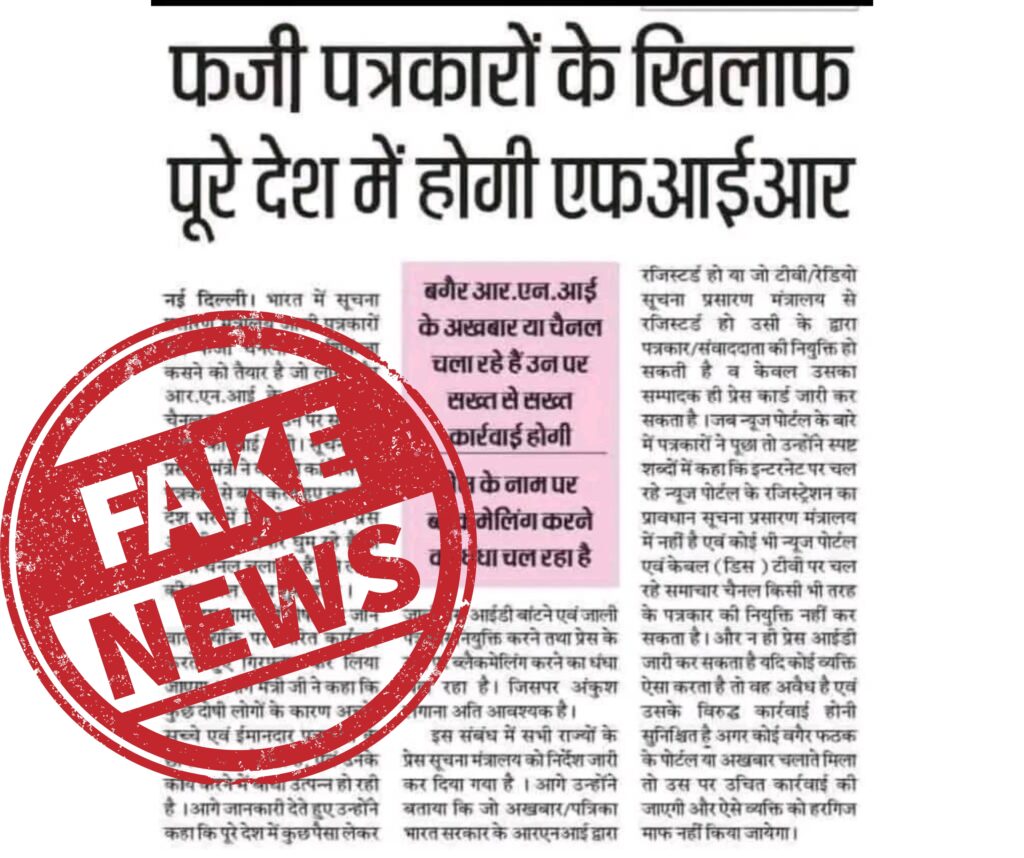 देश में डिजिटल पत्रकारिता की साख को ठेस पहुंचाने वाले फर्जी अखबारों और नकली प्रेस कार्ड गिरोह पर अब सरकार ने शिकंजा कसना शुरू कर दिया है। यह कार्रवाई तब तेज हुई जब भारतीय पत्रकार अधिकार परिषद् (BJAC) के राष्ट्रीय अध्यक्ष प्रवीण सिंह ने फर्जी मीडिया संस्थानों के विरुद्ध सूचना एवं प्रसारण मंत्रालय को विस्तृत शिकायत दर्ज कराई, जिसमें उन्होंने फर्जी अखबारों की कटिंग, नकली चैनलों की लिस्ट और जाली प्रेस आईडी कार्डों के प्रमाण सौंपे।