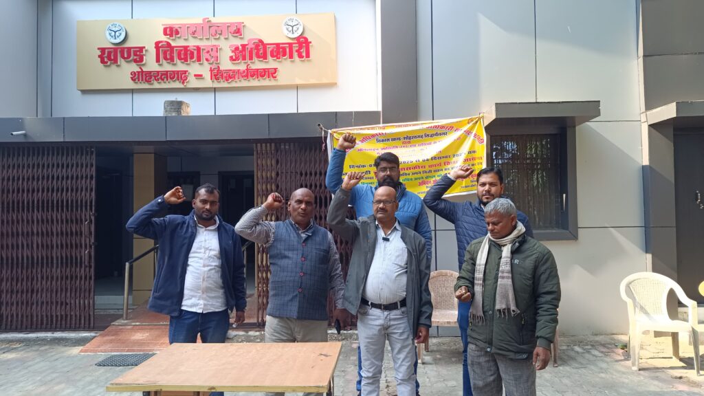 सोमवार को भी शोहरतगढ़ ब्लॉक मुख्यालय पर सभी सचिवों का विरोध प्रदर्शन लगातार जारी रहा। ऑनलाइन उपस्थिति (एफ.आर.एस.) एवं सचिवों से लिए जा रहे गैर-विभागीय कार्यों के विरोध में उन्होंने सोमवार को अपना डोंगल प्रभारी एडीओ (पं०) एवं सचिव कुंवर कन्नौजिया की अनुपस्थिति में प्रभारी एडीओ पं० गौरव श्रीवास्तव को सौंप दिया।