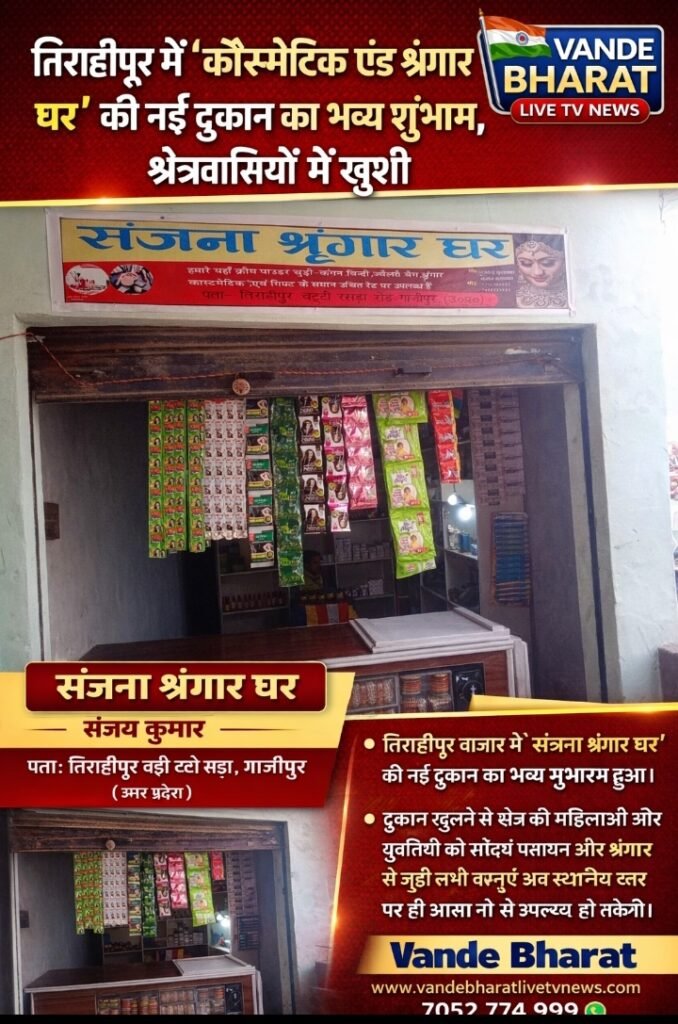 बलिया (रसड़ा): क्षेत्र के तिराहीपुर बाजार में आज कॉस्मेटिक एंड श्रृंगार घर की नई दुकान का भव्य शुभारंभ किया गया। दुकान खुलने से क्षेत्र की महिलाओं और युवतियों को अब सौंदर्य प्रसाधन और श्रृंगार से जुड़ी सभी वस्तुएं एक ही स्थान पर आसानी से उपलब्ध हो सकेंगी। 🌸