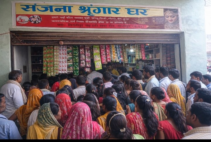 तिराहीपुर बाजार में नव उद्घाटित “कॉस्मेटिक एंड श्रृंगार घर” दुकान पर मौजूद स्थानीय लोग और ग्राहक।