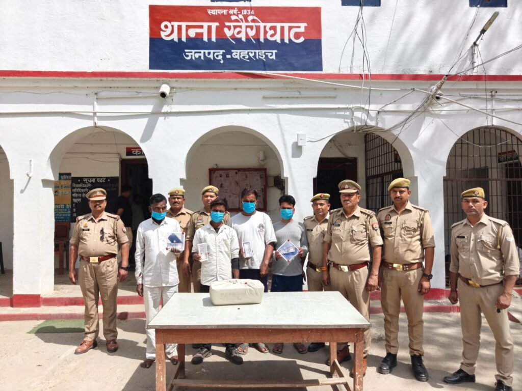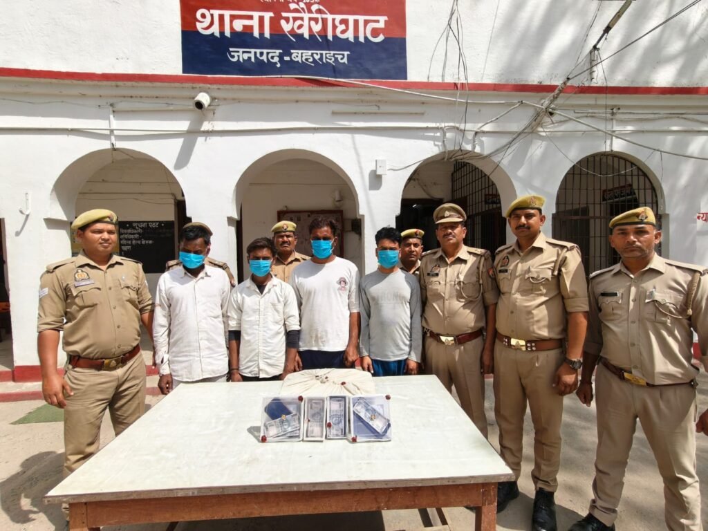 दिनांक 03/04.04.2026 की रात्रि को थाना खैरीघाट पुलिस टीम द्वारा थाना क्षेत्र में रात्रि गश्त की जा रही थी कि इसी दौरान पुलिस टीम को मुखबिर खास से सूचना मिली कि 04 व्यक्ति अवैध जाली करेन्सी नोट लेकर नानपारा इमामगंज की तरफ से बेहड़ा बाजार की तरफ आ रहे हैं । सूचना पर तत्काल पुलिस टीम द्वारा मुखबिर के बताए रास्ते पर गुजराती पुरवा मोड़ के निकट संदिग्ध प्रतीत हो रहे 04 व्यक्तियों 1.हरिराम लोध पुत्र स्व0 बाकेलाल उम्र 42 वर्ष निवासी गुलरिहा जगतापुर थाना मोतीपुर जनपद बहराइच, 2.अर्जुन पुत्र हरिराम उम्र 19 वर्ष निवासी गुलरिहा जगतापुर PS मोतीपुर जनपद बहराइच, 3.गुरुचरन सिंह उर्फ विजय उत्तराखण्ड पुत्र शर्मा सिंह उम्र 44 वर्ष निवासी दलराजपुर थाना सिंगाही जिला लखीमपुर खीरी, 4.सकीम उर्फ सूरज उत्तराखण्ड पुत्र अयूब उम्र 35 वर्ष निवासी चईपुरवा थाना सिगाही जिला लखीमपुर खीरी को रोककर पूछताछ व तलाशी ली गयी । तलाशी के दौरान उक्त व्यक्तियों के पास से 500-500 रुपये के कुल 23 जाली नोट (कुल कीमत 11,500 रूपये) व 01 प्रिन्टर बरामद किया गया । जिसके संबंध में कड़ाई से पूछताछ करने पर उनके द्वारा कलर प्रिंटर का उपयोग कर ₹500 मूल्यवर्ग के जाली भारतीय नोट तैयार करने, जाली नोट को असली नोट के रूप में दुकानों/बाजारों में देकर सामान व रुपये में बदलने तथा अतिरिक्त धन अर्जित करने के उद्देश्य से 01 असली नोट के बदले उसका तीन गुना अधिक जाली नोट देने की बात स्वीकार की गई । बरामदगी के आधार पर चारों अभियुक्तों को गिरफ्तार कर थाना स्थानीय पर मु0अ0सं0 113/2026 धारा- 179/181 बी.एन.एस पंजीकृत कर विधिक कार्यवाही करते हुए अभियुक्तों को बरामद माल के साथ गिरफ्तारशुदा अभियुक्तगण को विधिक कार्यवाही करते हुए माननीय न्यायालय रवाना किया गया ।