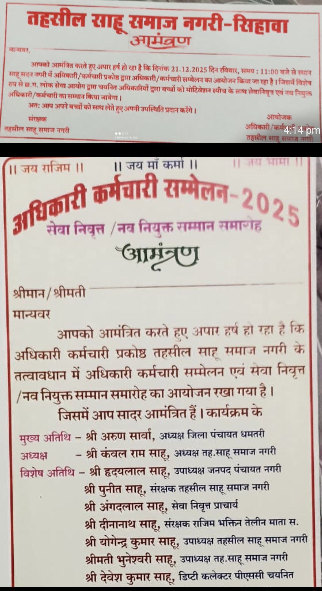 नगरी-आपको आमंत्रित करते हुए अपार हर्ष हो रहा है कि अधिकारी कर्मचारी प्रकोष्ठ तहसील साहू समाज नगरी के तत्वाधान में अधिकारी कर्मचारी सम्मेलन एवं सेवानिवृत्ति/ नवनियुक्त सम्मान समारोह का आयोजन 21 दिसंबर को रखा गया है ।उनके मुख्य अतिथि श्री अरुण सार्वा जी अध्यक्ष जिला पंचायत धमतरी एवं अध्यक्षता समाज प्रमुख श्री कंवल राम साहू अध्यक्ष तहसील साहू समाज नगरी करेंगे। विशिष्ट अतिथि साम्मानीय हृदय लाल साहू, पुनीत राम साहू ,अंगद लाल साहू, दीनानाथ साहू, योगेंद्र कुमार साहू, भुवनेश्वरी साहू ,योगेंद्र, देवेश कुमार साहू, गौरव साहू ,सुश्री वैभवी साहू ,चंद्रभान साहू ,रामनाथ साहू ,गैंद लाल साहू, एम आर साहू ,सोमेंद्र साहू ,प्रकाश साहू होंगे ।उक्त सामान समारोह दिनांक 21 12.2025 दिन रविवार पूर्वान्ह 11:00 बजे से स्थान तहसील साहू सदन नगरी में सेवानिवृत /नवनियुक्त छत्तीसगढ़ लोक सेवा आयोग द्वारा चयनित अधिकारियो एवं संरक्षक तहसील साहू समाज नगरीआयोजक अधिकारी कर्मचारी प्रकोष्ठ तहसील साहू समाज नगरी।