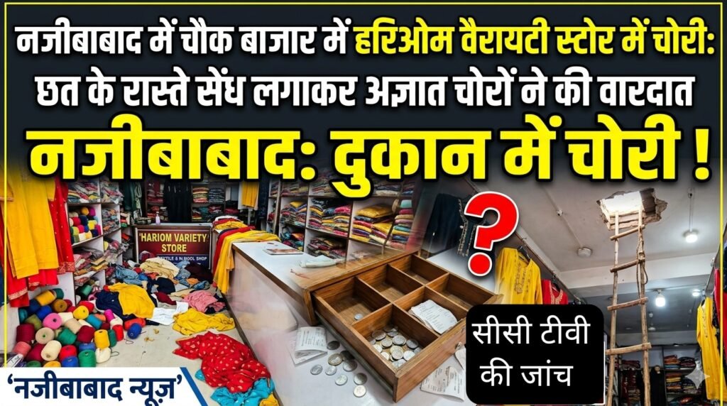 नजीबाबाद के चौक बाजार स्थित हरिओम वैरायटी स्टोर में 19 अप्रैल की रात चोरी की घटना हुई। अज्ञात चोरों ने छत के रास्ते दुकान में घुसकर वारदात को अंजाम दिया।