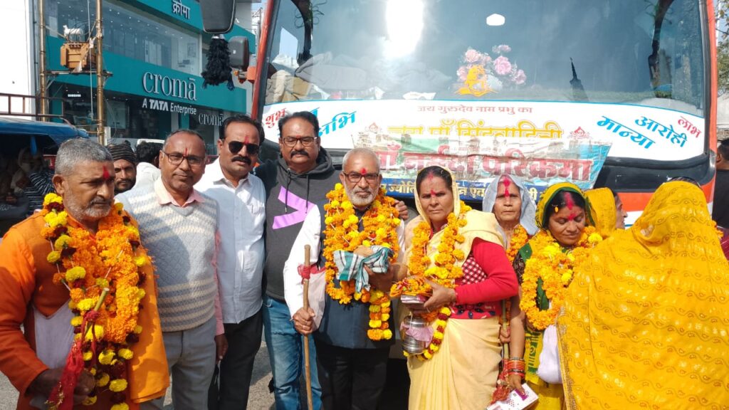 नर्मदा परिक्रमा पूरी कर वापस लौटे श्रद्धालुओं पर की गई पुष्पवर्षा