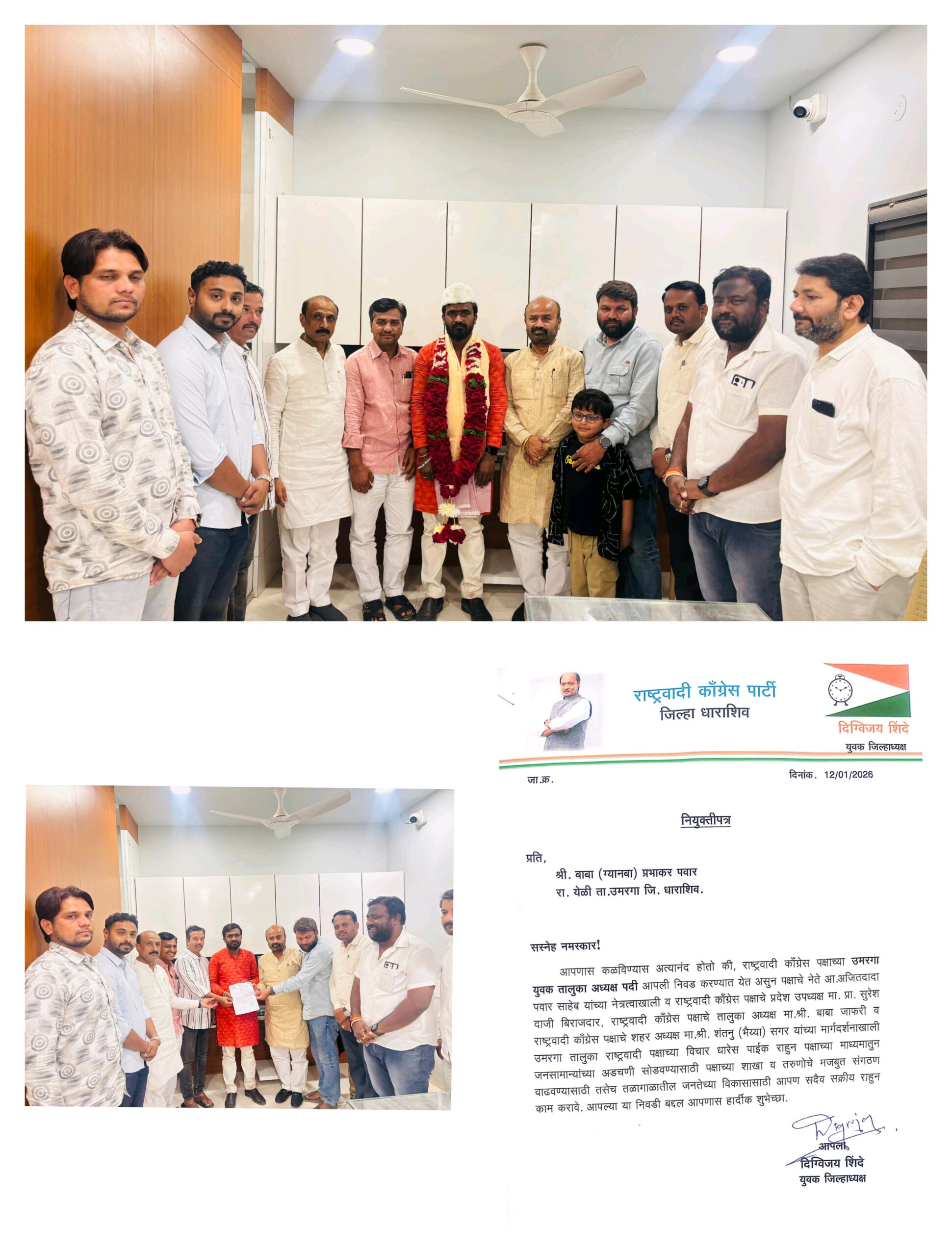 महाराष्ट्राचे लोकप्रिय *उपमुख्यमंत्री मा. ना. अजितदादा पवार साहेब, राष्ट्रवादी काँग्रेसचे प्रदेश उपाध्यक्ष मा. प्रा. सुरेश दाजी बिराजदार, तालुका अध्यक्ष मा. श्री. बाबा जाफरी आणि शहर अध्यक्ष मा. श्री. शंतनु (भैय्या) सगर* यांच्या मार्गदर्शनाखाली ही जबाबदारी पार पाडताना मला अतिशय आनंद होत आहे.
