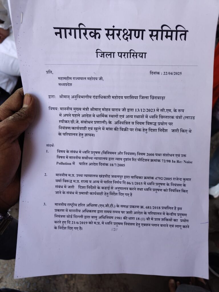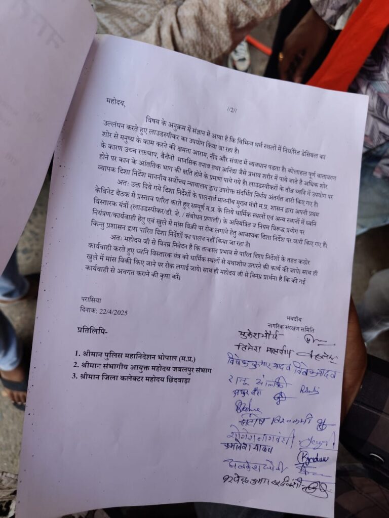 विषयः माननीय मुख्य मंत्री श्रीमान् मोहन यादव जी द्वारा 13/12/2023 में सी.एम. के रूप में अपने पहले आदेश मे धार्मिक स्थलों एवं अन्य स्थानों में ध्वनि विस्तारक यंत्रों (लाउड स्पीकर/डी. जे. संबोधन प्रणाली) के अनियंत्रित व नियम विरूद्ध प्रयोग पर नियंत्रण/कार्यवाही एवं खुले में मांस की बिक्री पर रोक हेतु दिशा निर्देश जारी किए थे के परिपालन हेतु ज्ञापन।