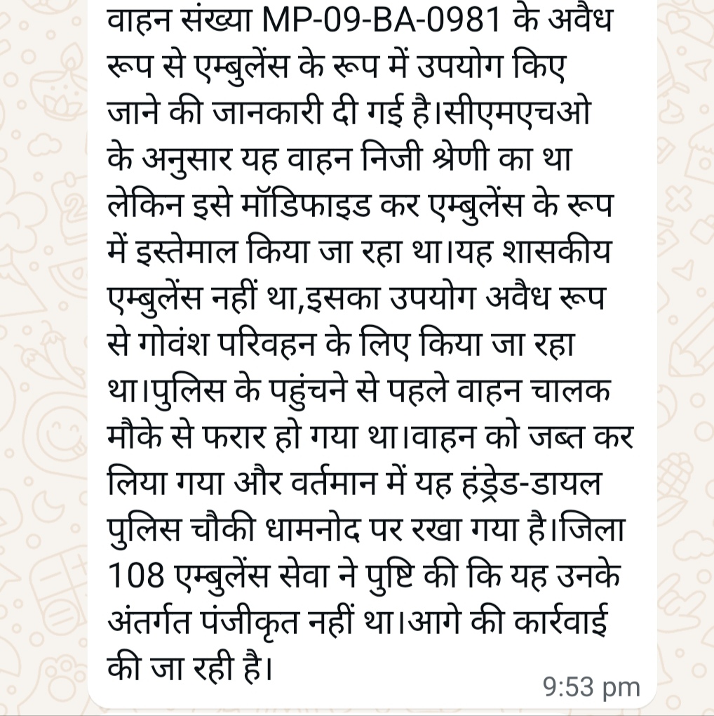 धार पुलिस के पहुंचते ही एंबुलेंस का चालक फरार हो गया है