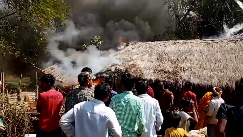 दुकान में आग की लपट और ग्रामीण