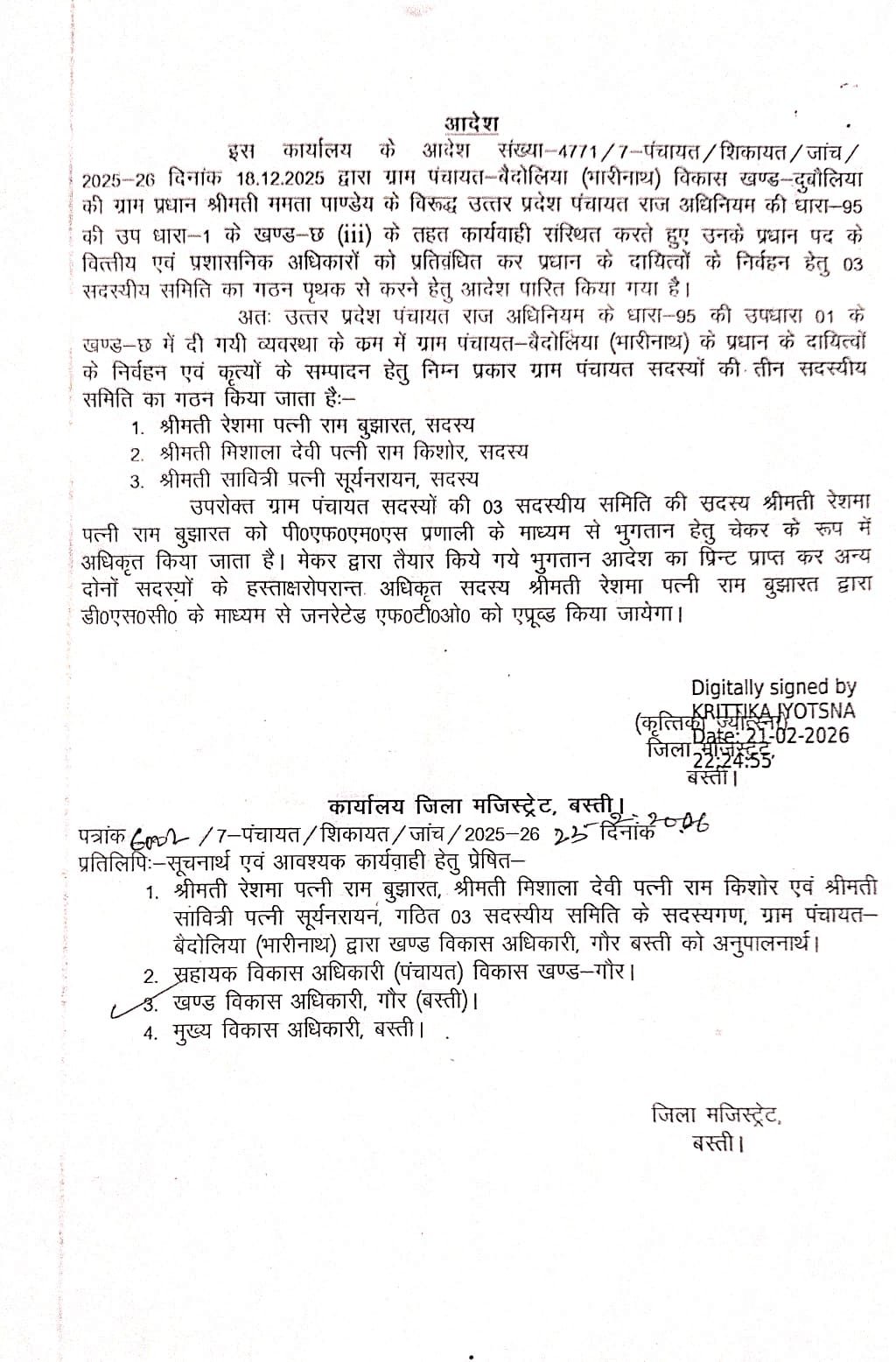 बीती 21 फरवरी 2026 को जिलाधिकारी ने पूर्व प्रधान श्रीमती ममता पाण्डेय के विरुद्ध जांच पूरी होने के उपरांत उनकी शक्तियों को प्रतिबंधित कर दिया था। इसके विकल्प के रूप में शासन ने तीन सदस्यीय समिति का गठन किया, जिसमें श्रीमती रेशमा देवी को समिति प्रमुख नियुक्त करते हुए PFMS चेकर की जिम्मेदारी सौंपी गई थी।