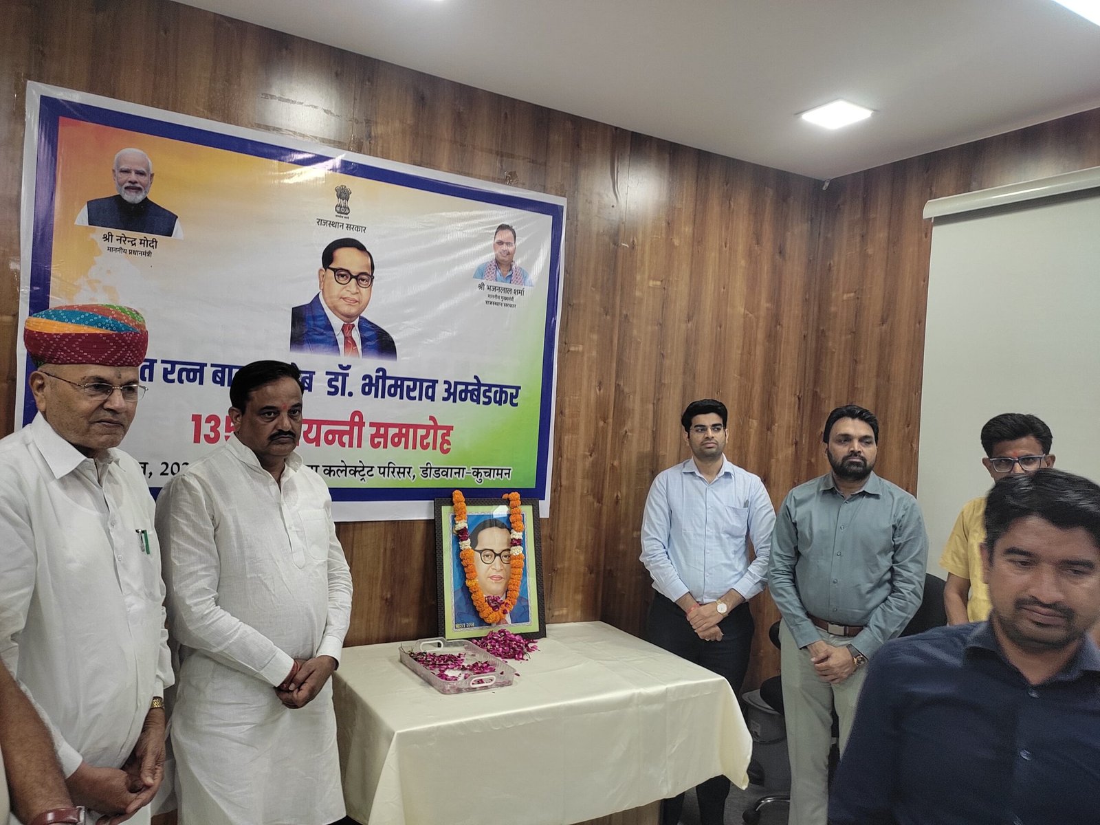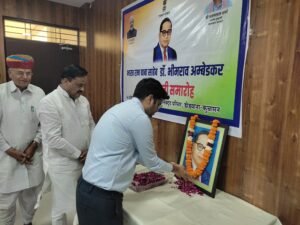 डीडवाना-कुचामन। भारत रत्न डॉ. भीमराव अम्बेडकर की जयंती के उपलक्ष्य में मंगलवार को जिले में विभिन्न कार्यक्रमों का आयोजन किया गया। इस अवसर पर जिला मुख्यालय पर कलेक्ट्रेट सभागार में आयोजित जिला स्तरीय कार्यक्रम में जिला कलक्टर श्री अवधेश मीणा, पूर्व जिला प्रमुख श्री भागीरथ चौधरी एवं जीतेंद्र सिंह जोधा सहि अन्य जन प्रतिनिधियों एवं अधिकारियों ने डॉ. भीमराव अम्बेडकर के चित्र पर पुष्प अर्पित कर बाबा साहेब का स्मरण किया।