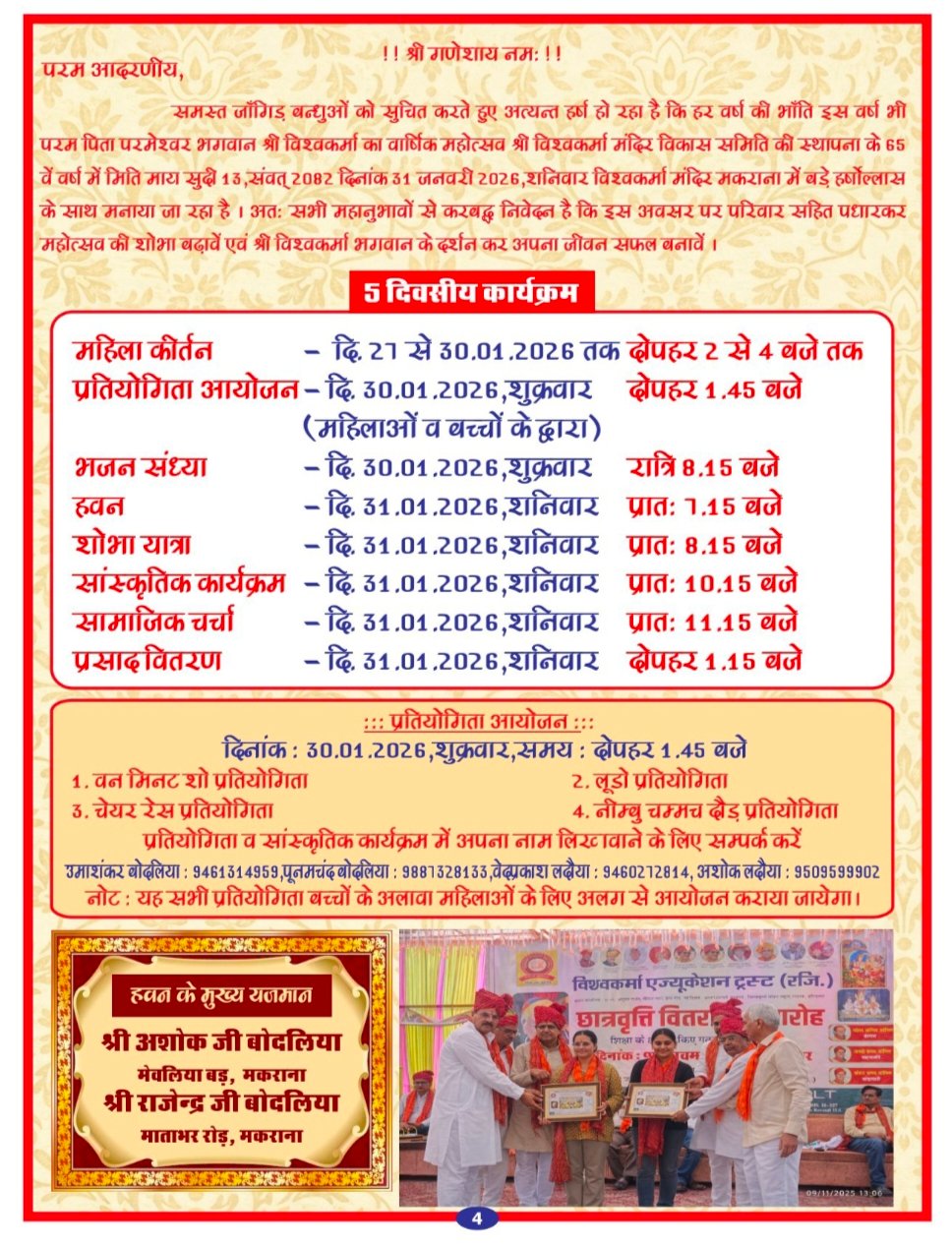 मंदिर समिति ने बताया कि महोत्सव के दौरान महिलाओं द्वारा भजन कीर्तन किया जाएगा शुक्रवार दोपहर 2:00 बजे समाज की महिलाओं और बच्चों के लिए लूडो, मेहंदी,चेयर और वन मिनट शो जैसी विभिन्न प्रतियोगिताओं का आयोजन होगा। इसी दिन शाम 8:15 बजे से भजन संध्या का आयोजन किया जाएगा इस दौरान विश्वकर्मा मंदिर विकास समिति मकराना के अध्यक्ष रामेश्वर लाल कँवलेचा कार्यकारी अध्यक्ष उमाशंकर जांगिड़ महिला मंडल अध्यक्ष प्रेमलता जांगिड़ कार्यकारी अध्यक्ष मनभरी बोदलिया आनंदी रोहिलीवाल महिला प्रकोष्ठ जिला अध्यक्ष ममता सिलक सहित मंदिर समिति के सदस्य वेद प्रकाश पूनम चंद बोदलिया नटवरलाल जांगिड़, संगीता जांगिड़ उपस्थित रहे।