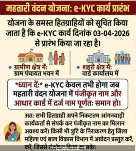 राज्य शासन के निर्देशानुसार महतारी वंदन योजना के अंतर्गत पंजीकृत सभी हितग्राहियों का ई-केवाईसी कराना अनिवार्य किया गया है। योजना का लाभ प्राप्त कर रही सभी पात्र महिलाएं यह सुनिश्चित करें कि वे निर्धारित समय-सीमा के भीतर अपना ई-केवाईसी अवश्य पूर्ण करा लें। ई-केवाईसी की प्रक्रिया 30 जून 2026 तक शिविरों के माध्यम से की जाएगी। जिन हितग्राहियों का ई-केवाईसी इस अवधि में पूर्ण नहीं हो पाएगा, उनके लिए 01 जुलाई 2026 से 31 अगस्त 2026 तक संबंधित परियोजना कार्यालयों में विशेष व्यवस्था की जाएगी।