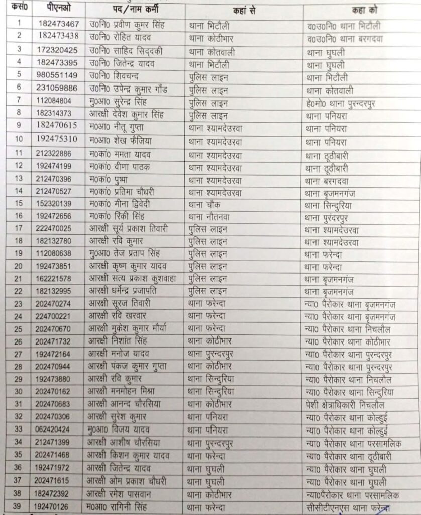 दिनांक 22 अक्टुबर 2025 । जनपद महराजगंज के पुलिस अधीक्षक सोमेन्द्र मीणा ने आज कानून व्यवस्था को और चुस्त दुरुस्त करने हेतु कुल 39 पुलिस कर्मियों का किया तबादला।