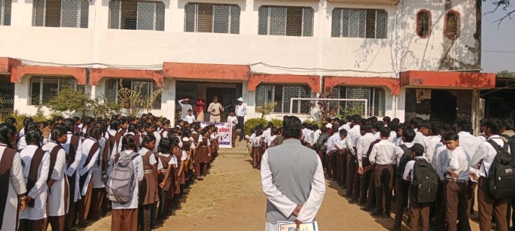 आज दिनांक 19.01.2026 को राष्ट्रीय सड़क सुरक्षा माह के अंतर्गत 01 जनवरी 2026 से 31 जनवरी 2026 तक चलने वाली आयोजित कार्यक्रम के तहत यातायात पुलिस महासमुंद के द्वारा सरस्वती शिशु मंदिर महासमुंद में जाकर विद्यालय मे अध्यनरत 298 छात्र-छात्राओं को यातायात में नियम एवं संकेत के बारे में जानकारी देकर जागरूक किया गया साथ ही यातायात जागरूकता संबंधित पंपलेट वितरण कर पालन करने समझाईश दिया गया।