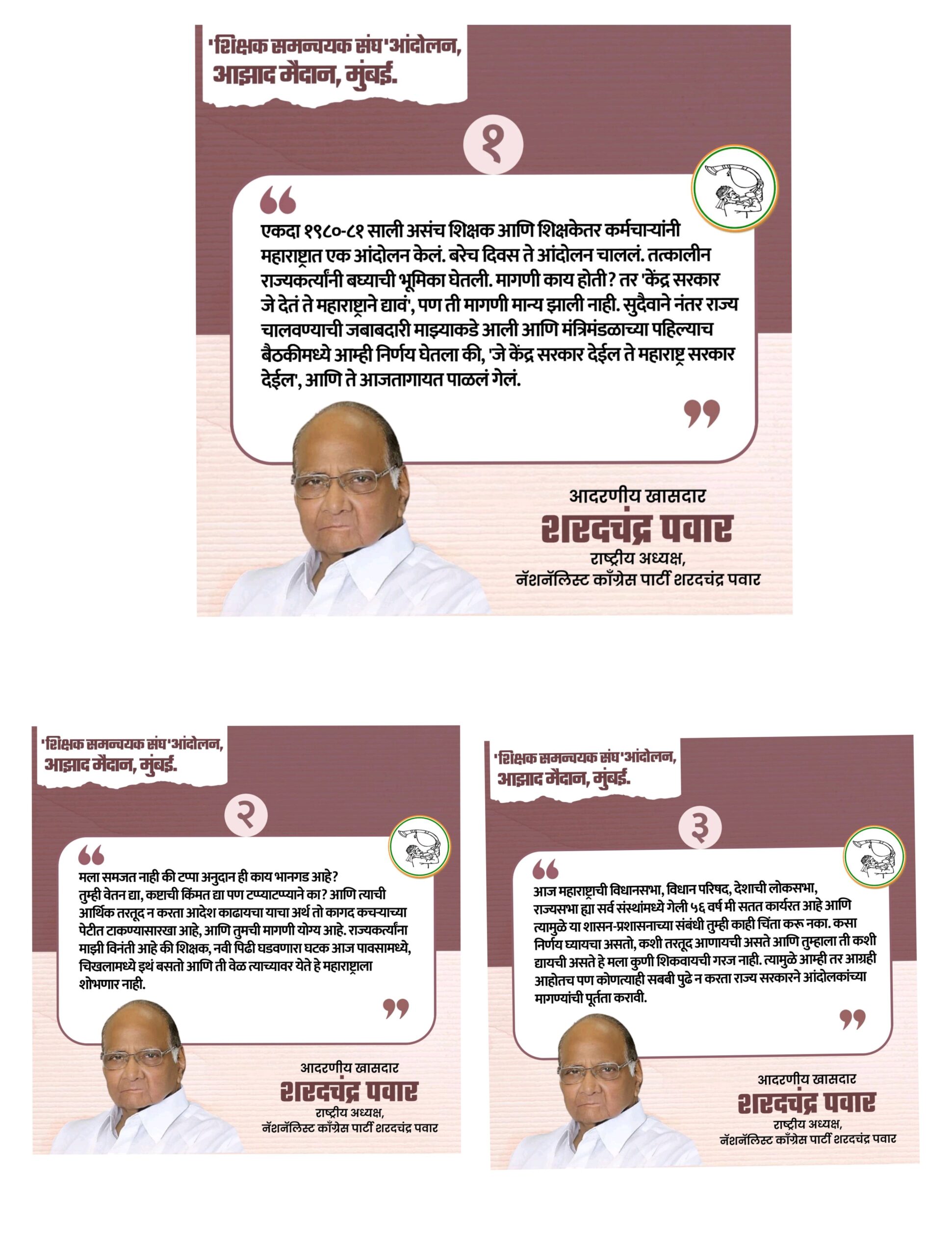 “मी गेली ५६ वर्षे विविध राज्य व राष्ट्रीय संस्थांमध्ये कार्यरत आहे. शासन-प्रशासन कसे चालवायचे, निर्णय कसा घ्यायचा हे मला शिकवण्याची गरज नाही. त्यामुळे राज्य सरकारने कोणतीही सबब न देता आंदोलकांच्या मागण्या तात्काळ पूर्ण कराव्यात,” असे परखड मत ‘नॅशनॅलिस्ट काँग्रेस पार्टी – शरदचंद्र पवार’ पक्षाचे राष्ट्रीय अध्यक्ष, आदरणीय खासदार श्री. शरदचंद्रजी पवार यांनी व्यक्त केले. ते ‘शिक्षक समन्वयक संघा’च्या विविध मागण्यांसाठी आझाद मैदान, मुंबई येथे आयोजित आंदोलनात सहभागी झाले होते.