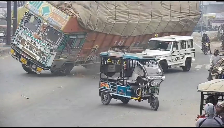 भूसे से भरा तेज रफ्तार ट्रक चलती बोलेरो कर पर पलटा ट्रक के नीचे दबने से बोलेरो सवार चालक कीदर्दनाक मौत