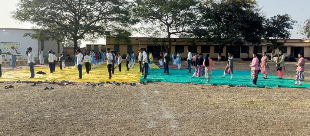 सामूहिक सूर्य नमस्कार कार्यक्रम में ग्रामीण जनप्रतिनिधियों के साथ समस्त शिक्षक, शिक्षिकाएं छात्र-छात्राएं उपस्थित थी।