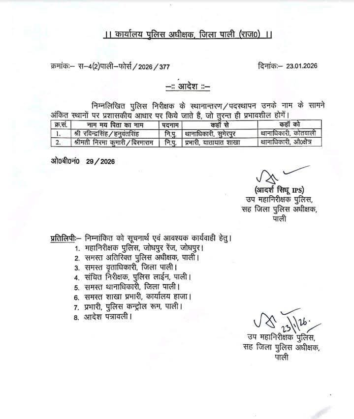 रविंद्रसिंह कोतवाली व निरमा विश्नोई होगी औद्योगिक थानाधिकारी पाली । पुलिस अधीक्षक आदर्श सिधू ने जारी किये आदेश : रविंद्रसिंह को सुमेरपुर थाने से कोतवाली थाना और निरमा कुमारी को यातायात से औद्योगिक थानाधिकारी लगाया।