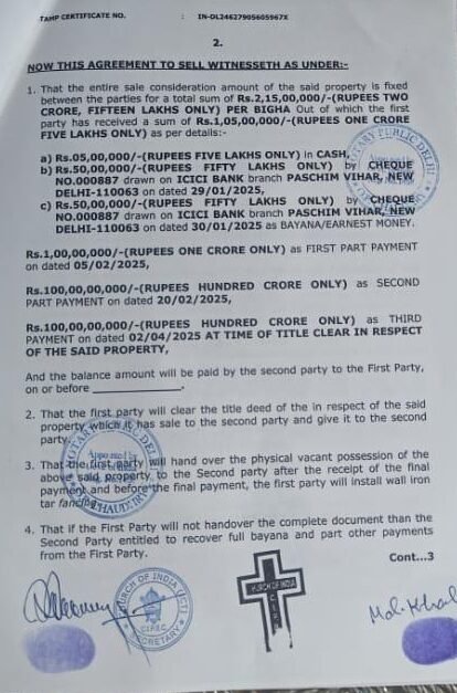 329 बीघा भूमि के स्थल विवरण, भुगतान संरचना और न्यासी बहुमत प्रक्रिया इतनी जटिल बनाई गई कि केवल प्रशासनिक और न्यायिक निगरानी के माध्यम से ही विवाद सुलझाया जा सकता है। पहला बयाना ₹2.15 करोड़, दूसरा ₹100 करोड़, तीसरा ₹100 करोड़ भूमि-शीर्षक मिलने पर। यदि विक्रेता अनुबंध की शर्तों का पालन नहीं करता, तो बयाना राशि दोगुनी लौटाई जाती है, और यदि क्रेता पीछे हटे तो अग्रिम धन राशि समायोजित की जाती है।