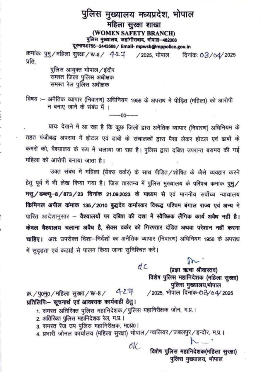 भोपाल.. पुलिस मुख्यालय द्वारा सभी जिलों के पुलिस अधीक्षकों और भोपाल-इंदौर पुलिस आयुक्तों को जारी निर्देश में कहा गया है कि रेड के दौरान पकड़ी जाने वाली महिला सेक्स वर्कर को ना गिरफ्तार किया जाएगा और ना ही परेशान किया जाएगा।