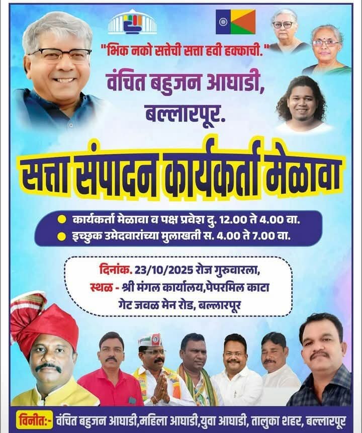 वंचित बहुजन अघाड़ी बल्लारपुर तालुका शहर की “सत्ता अधिग्रहण कार्यकर्ता बैठक” गुरुवार, 23 अक्टूबर 20025 को दोपहर 12 बजे श्री मंगल कार्यालय, मेन रोड बल्लारपुर, काटा गेट के पास आयोजित की गई है। इस बैठक के लिए पूर्व विदर्भ अध्यक्ष माननीय भगवानभाऊ भोंडे एवं प्रदेश कार्यकारिणी सदस्य माननीय. कुशलभाऊ मेश्राम जी के साथ विदर्भ संयोजक मा. विवेकभाऊ हाडके, मा. अरविन्दजी चांदेकर माननीय. हितेश मडावी माननीय. प्रफुल्लजी मानके माननीय. बालूभाऊ टेंभुर्डे माननीय. प्रकाशजी तावड़े माननीय. कविताताई गौरकर माननीय. मुख्य रूप से शुभम मंडपे एवं अन्य गणमान्य उपस्थित रहेंगे। बल्लारपुर नगर परिषद के आम चुनाव के साथ-साथ जिला परिषद पंचायत समिति नगर पंचायत के आम चुनाव में वंचित बहुजन अघाड़ी के संगठन को मजबूत करने के उद्देश्य से इस सभा का आयोजन किया गया है। उपरोक्त गणमान्यों के साथ पार्टी के तालुका अध्यक्ष, शहर अध्यक्ष, जिला पदाधिकारी और सभी कार्यकर्ता और पदाधिकारी बड़ी संख्या में उपस्थित रहेंगे। इस सभा के माध्यम से बल्लारपुर शहर में ऐसी स्थिति बनाई जाएगी कि बल्लारपुर शहर की जनता को, विशेष रूप से 2019 के लोकसभा विधानसभा चुनाव की याद ताजा हो जाएगी । वंचित बहुजन आघाड़ी संगठन आगामी नगरपालिका चुनावों के लिए बड़ी मजबूती के साथ चुनाव की तयारी कर रहा है और कार्यकर्ताओं में ऐसा विश्वास पैदा हो गया है कि हम बल्लारपुर नगरपालिका की सत्ता हासिल करेंगे। शहर अध्यक्ष उमेश कडू ने शहर और तालुका के कार्यकर्ताओं और समर्थकों को बड़ी संख्या में उपस्थित होने का आह्वान किया है, जैसी जानकारी शहर महासचिव गौतम रामटेके ने एक पत्रक के माध्यम से दी है।