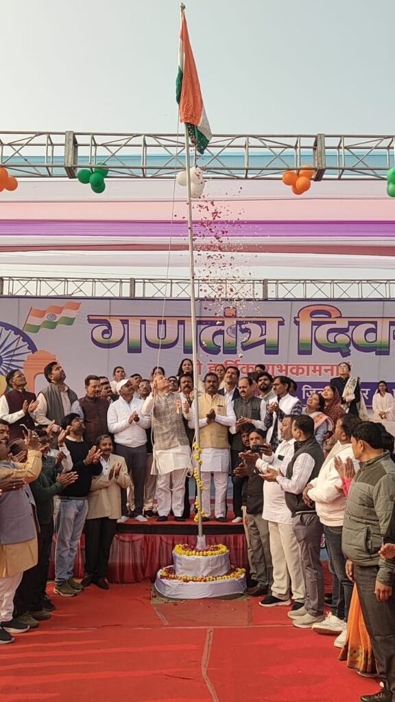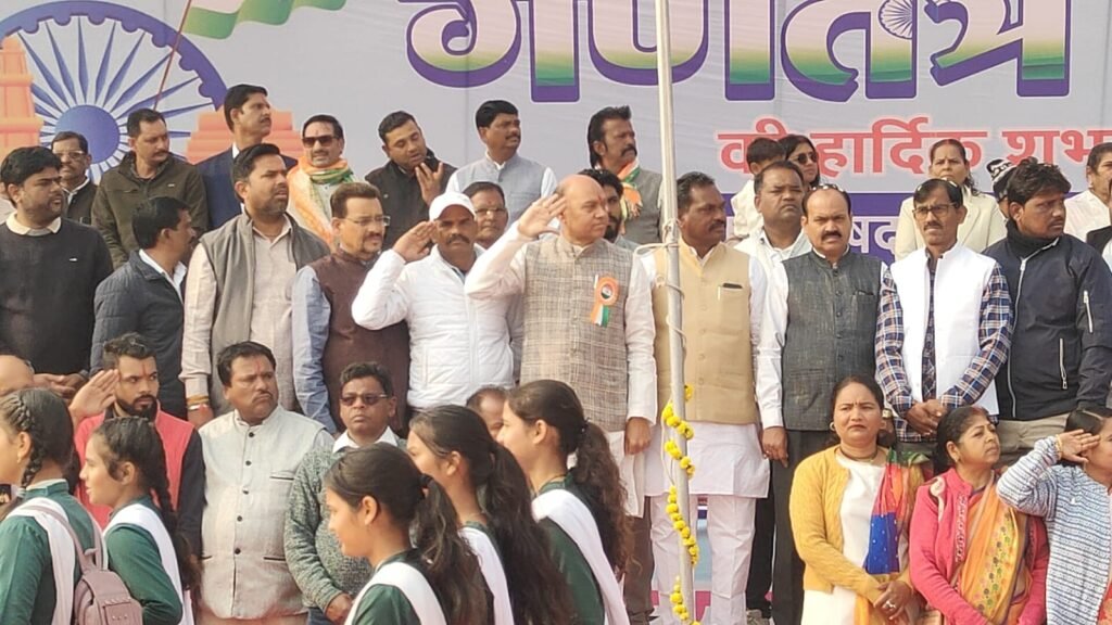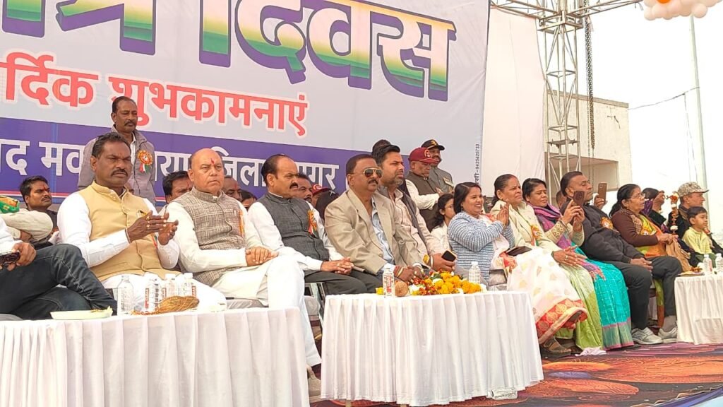 सागर/वंदे भारत लाइव टीवी न्यूज रिपोर्टर सुशील द्विवेदी 8225072664 * नरयावली विधानसभा क्षेत्र के हृदय स्थल, नगर पालिका परिषद मकरोनिया के नगर स्टेडियम में 77वां गणतंत्र दिवस केवल एक पर्व नहीं, बल्कि राष्ट्रवाद और सामूहिक उत्साह का एक महाकुंभ बन गया। क्षेत्रीय विधायक इंजीनियर प्रदीप लारिया के मुख्य आतिथ्य में आयोजित यह समारोह अपनी भव्यता, अनुशासन और ओजस्वी वातावरण के कारण लंबे समय तक याद रखा जाएगा। समारोह का शुभारंभ मुख्य अतिथि विधायक प्रदीप लारिया द्वारा दीप प्रज्वलन और माँ सरस्वती के पूजन के साथ हुआ। राष्ट्र के निर्माताओं को स्मरण करते हुए महापुरुषों के छायाचित्रों पर पुष्प अर्पित कर उन्हें भावभीनी श्रद्धांजलि दी गई। इसके पश्चात, जैसे ही विधायक लारिया ने ध्वजारोहण किया, समूचा परिसर राष्ट्रगान की गूँज से ओतप्रोत हो गया। आकाश में छोड़े गए रंग-बिरंगे गुब्बारों ने शांति और प्रगति का संदेश हवाओं में बिखेर दिया।