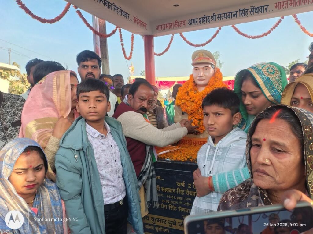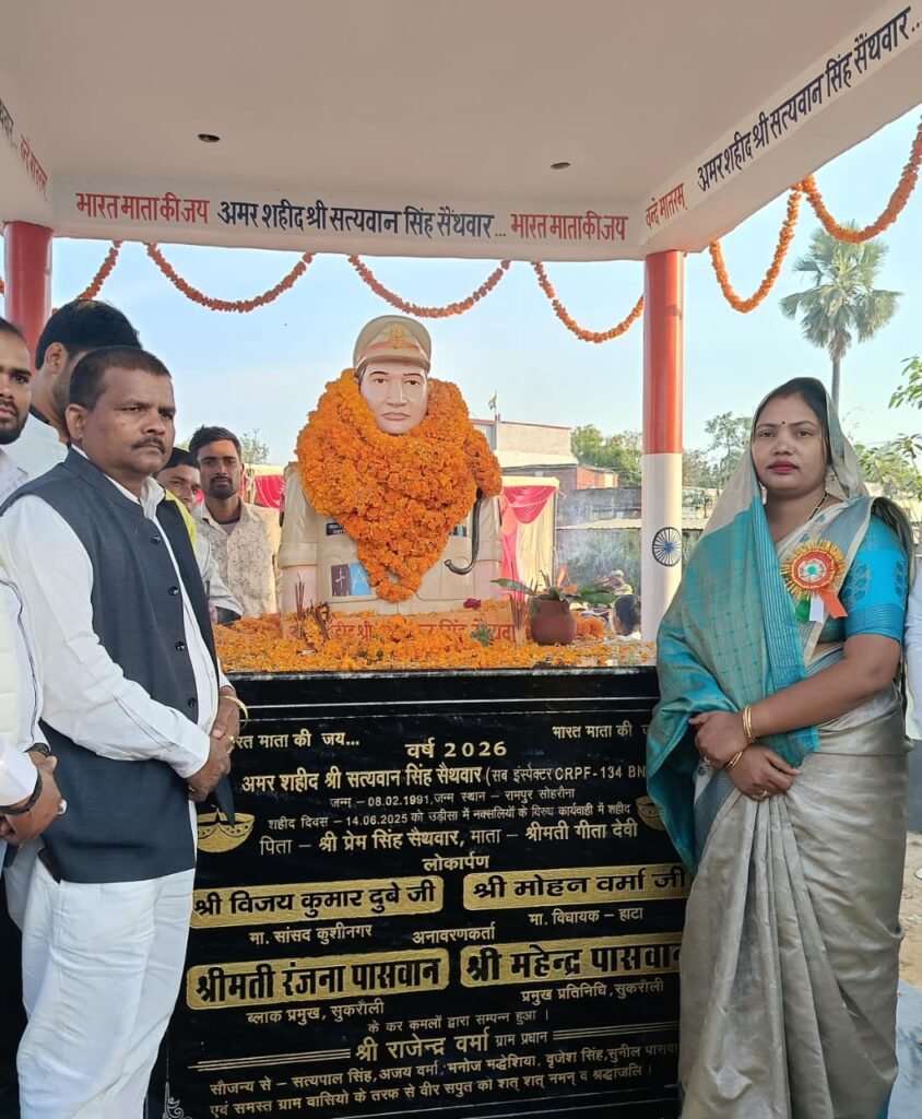 यह कार्यक्रम 26 जनवरी 2026 को आयोजित किया गया, जिसमें हाटा विधायक मोहन वर्मा और सुकरौली ब्लॉक प्रमुख रंजना पासवान ने संयुक्त रूप से प्रतिमा का अनावरण किया। मूर्ति से पर्दा हटते ही पूरा गांव ‘भारत माता की जय’ और ‘शहीद सत्यवान अमर रहें’ के नारों से गूंज उठा। ग्रामीणों, जनप्रतिनिधियों और शहीद के परिजनों ने पुष्प अर्पित कर उन्हें श्रद्धांजलि दी। शहीद सत्यवान सिंह सैथवार रामपुर सोहरौना गांव के निवासी थे और सीआरपीएफ की 134वीं बटालियन में सब-इंस्पेक्टर के पद पर तैनात थे। 13 जून 2025 की शाम ओडिशा में नक्सलियों के खिलाफ चलाए जा रहे तलाशी अभियान के दौरान वे एक आईईडी विस्फोट में गंभीर रूप से घायल हो गए थे। अगले दिन 14 जून को राउरकेला स्थित अपोलो अस्पताल में इलाज के दौरान उन्होंने देश के लिए अपने प्राण न्यौछावर कर दिए। प्रतिमा पर माल्यार्पण करते समय प्रियंका का सब्र टूट गया। उनकी आंखों से बहते आंसू पति के बिछड़ने का दर्द और उनके बलिदान पर गर्व—दोनों को बयां कर रहे थे। इस दौरान उन्होंने कहा कि वादे तो सभी करते हैं, लेकिन उन्हें निभाने वाले बहुत कम होते हैं। उनके शब्द सुनकर महिलाएं, बुजुर्ग और युवा सभी भावुक हो उठे, हालांकि हर चेहरे पर शहीद के प्रति सम्मान और गर्व भी झलक रहा था। कार्यक्रम को संबोधित करते हुए हाटा विधायक मोहन वर्मा ने कहा कि शहीद सत्यवान की कुर्बानी को कभी भुलाया नहीं जा सकता। उन्होंने घोषणा की कि जल्द ही शहीद के नाम पर गांव में एक गेट और सड़क का निर्माण कराया जाएगा। उन्होंने कहा, “मैं सत्ता में रहूं या न रहूं, शहीदों के सम्मान के लिए हमेशा खड़ा रहूंगा। जिस गांव का एक नौजवान देश के लिए शहीद होता है, वह केवल गांव ही नहीं, बल्कि पूरे देश का गौरव होता है।” वहीं सुकरौली ब्लॉक प्रमुख रंजना पासवान ने कहा कि यह दिन खुशी और गम दोनों का है। एक ओर गणतंत्र दिवस का उत्सव है, तो दूसरी ओर एक वीर सपूत की यादें।